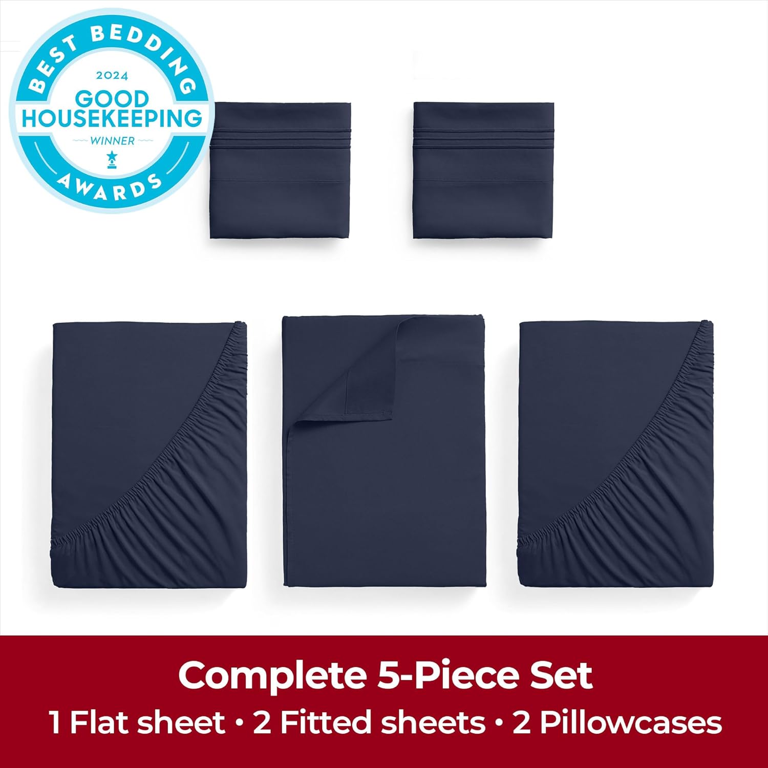 Mellanni Extra Deep Split King Sheets - 5 PC Iconic Collection Bedding - Hotel Luxury, Ultra Soft, Cooling Bed Sheets - Wrinkle, Fade, Stain Resistant (Split King, Navy Blue)