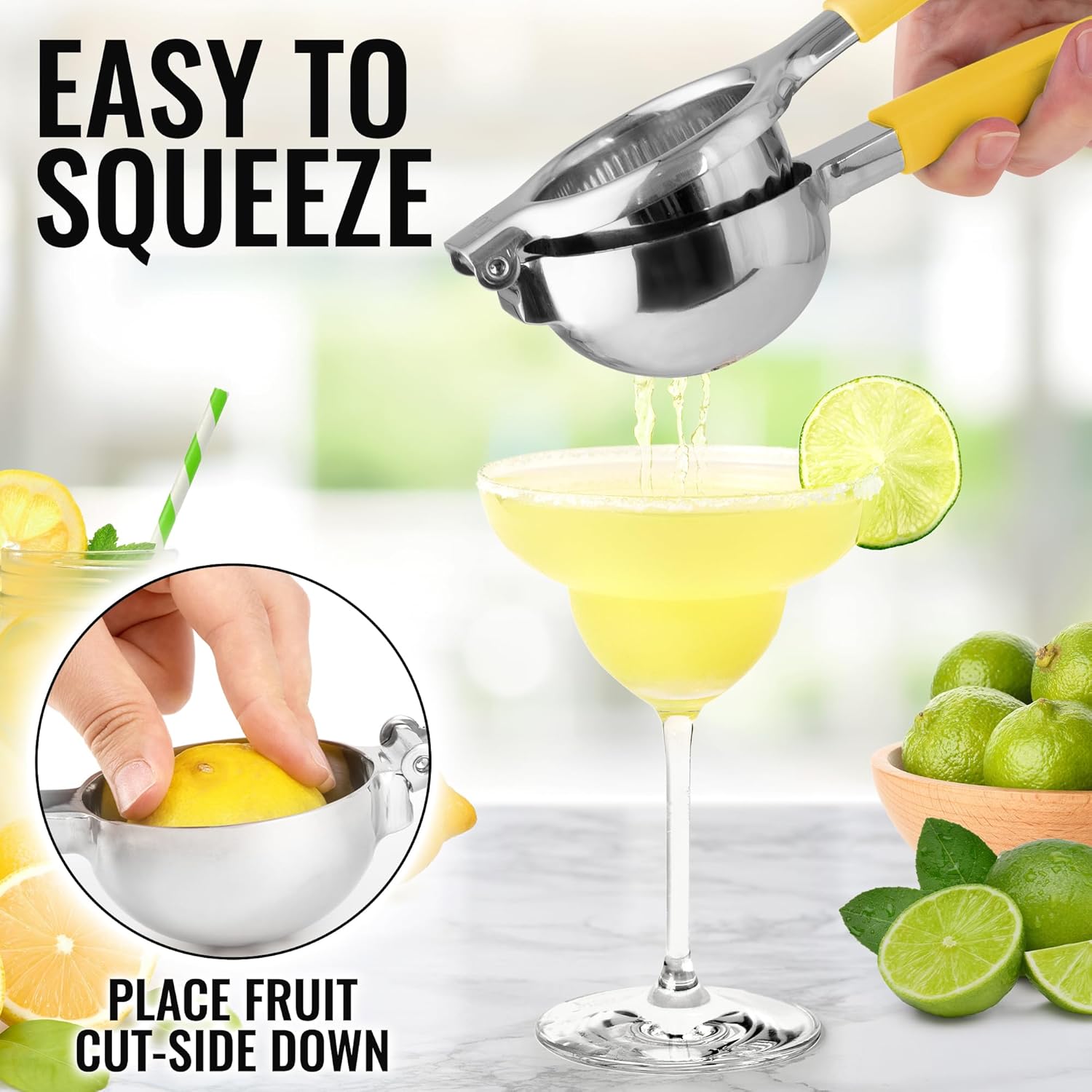 - ENGINEERED TO BE EASY ON THE HANDS: Watch limes lemons and even oranges beg for mercy even with a soft squeeze of the hand. If you are used to hand-squeezing citrus you will be truly amazed at how easy it is to use this professional lemon squeezer. Consider getting two - one for you and one for your best friend you may just enjoy when they serve you a nice margarita or martini replete with a plastic cocktail pick.