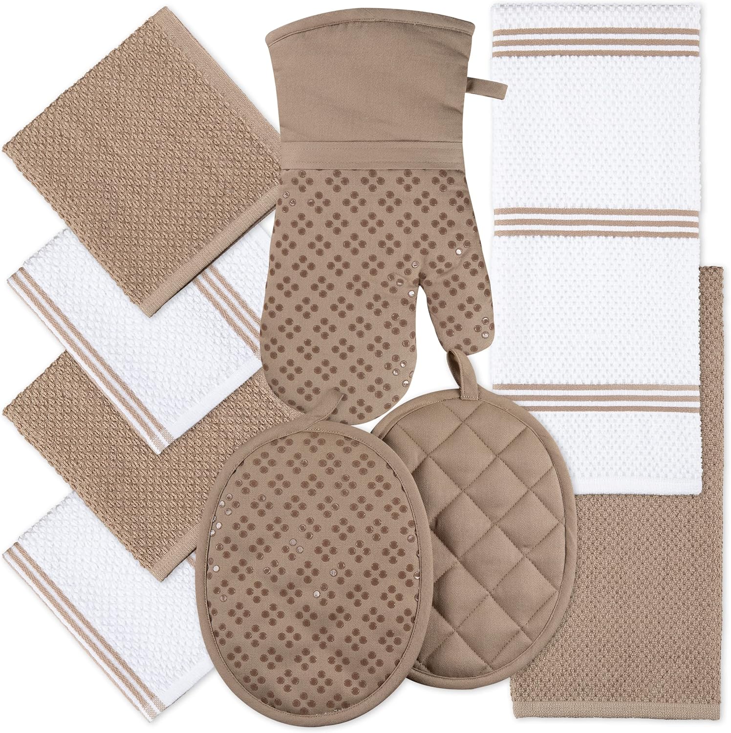 Sticky Toffee 9-Piece Kitchen Set – Tan 100% Cotton Terry Dish Towels, Dishcloths, Oven Mitts, and Pot Holders with Non-Slip Silicone Grip, Oeko-Tex Cotton