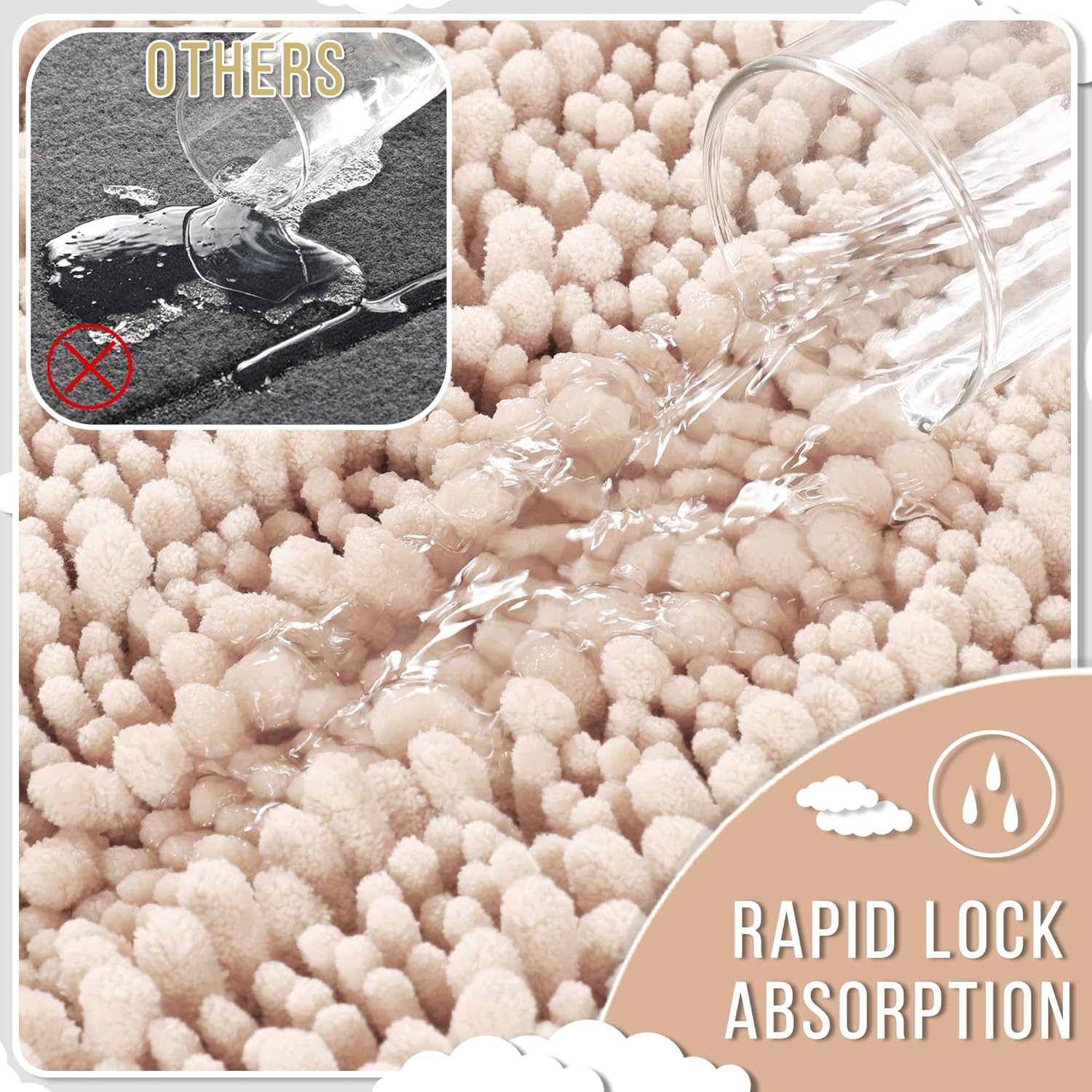 - Massive Water Absorption in Seconds: 5X faster than other materials mats, Yimobra bath mat absorbs 1000ml of water in 3 seconds. The vertical fiber channels lock moisture away from the surface, keeping your bathroom floor dry and discouraging damp environments. Perfect as a shower exit guard or sink splash catcher