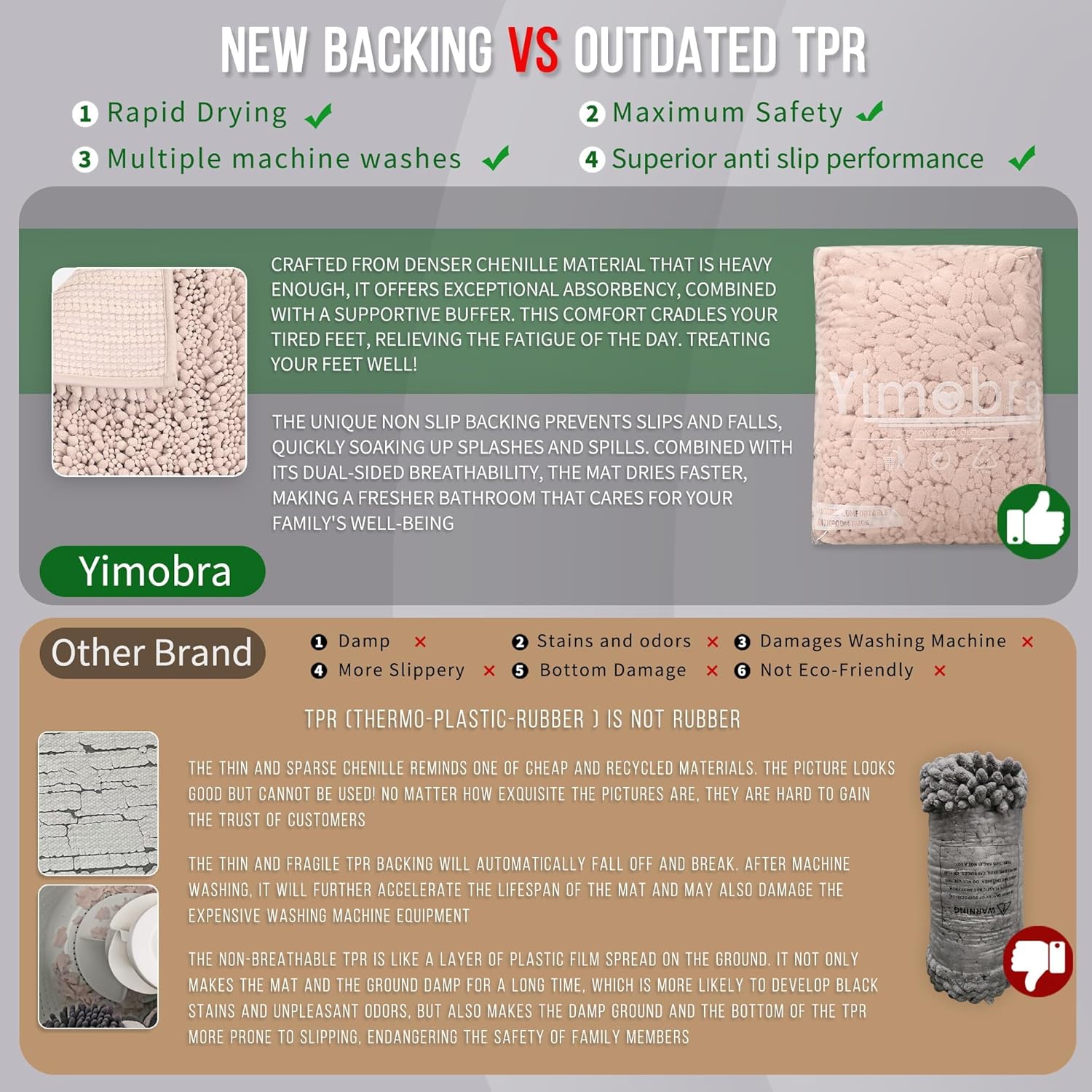 - Total Grip Safety & Quick Dry: Yimobra bath rug features a feather-light yet ultra-grippy hot-melt backing that stays firmly in place on wet surfaces. Its vertical air-channel chenille fibers ensure rapid and complete dryness, providing instant dry safety the moment you step out of the shower. The product is tested for harmful substances, performance, longevity, and emissions in accordance with the OEKO-TEX Standard 100