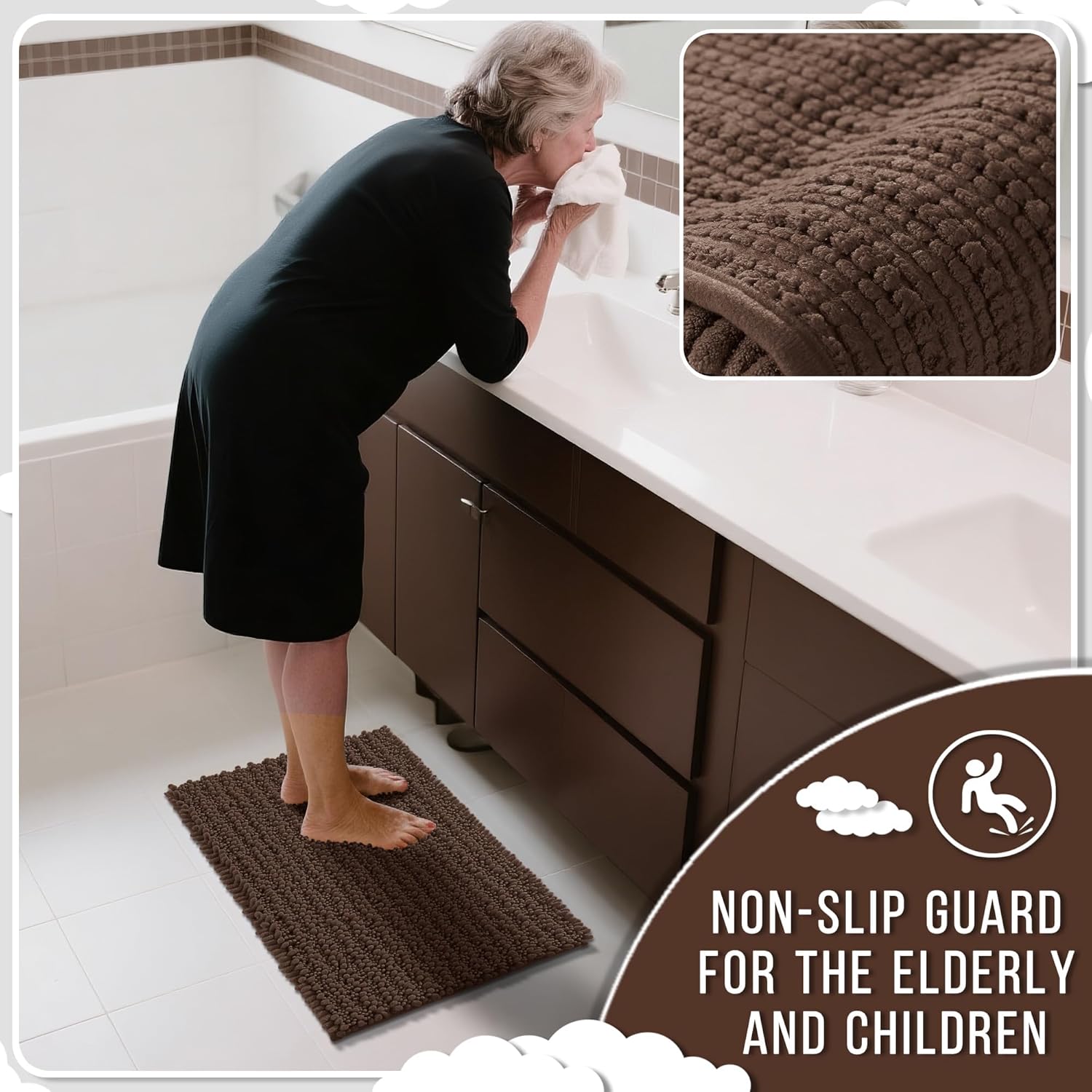 - Ultimate Cloud-Like Soft Comfort: Experience walking on clouds with our extra thick chenille bathroom mat! The ultra plush high pile density cradles your feet, banishing cold tiles after showers. It is perfect for adding warmth to any bathroom floor, transforming routine steps into luxury moments