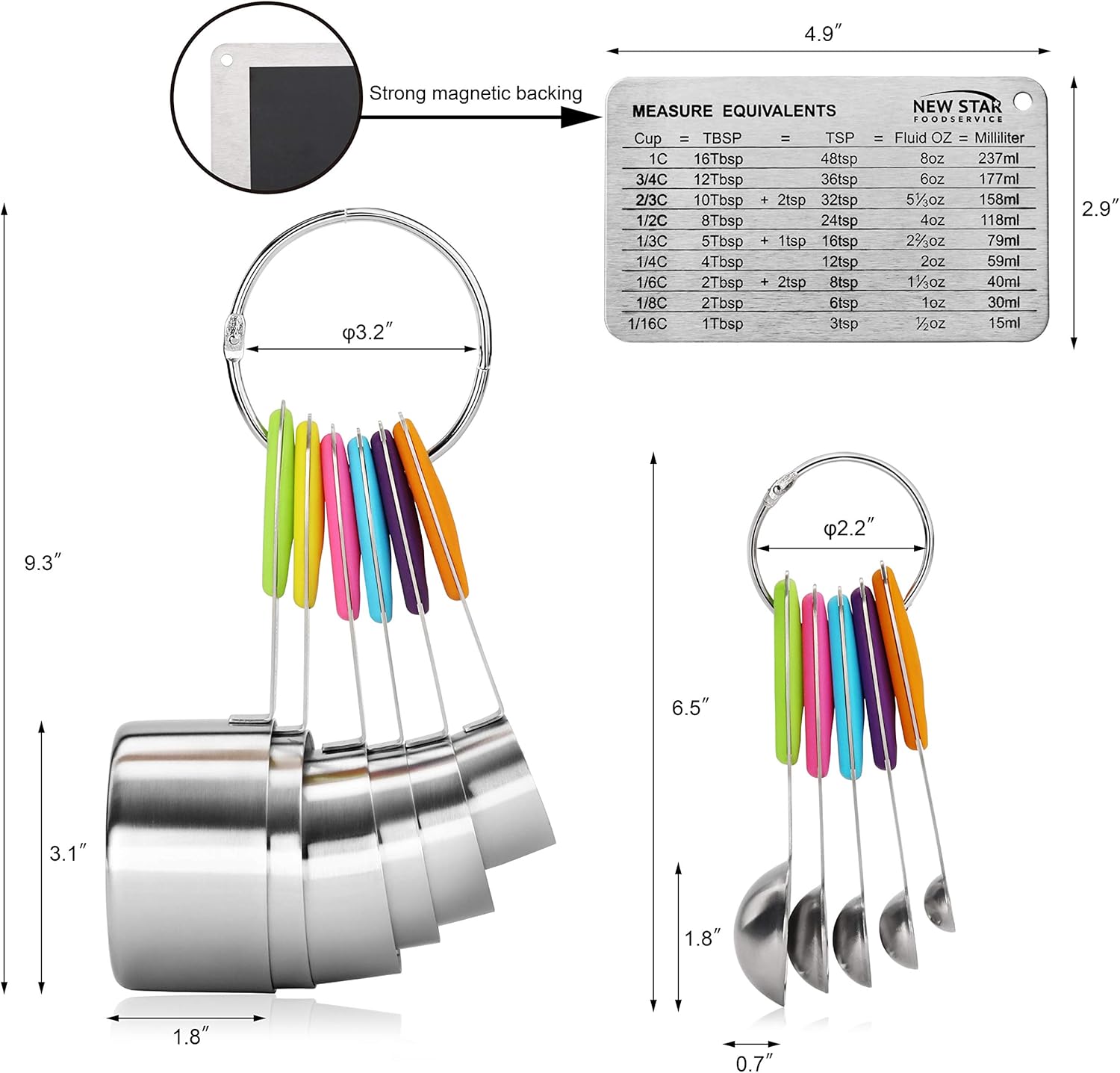 - 12-Piece Set:1/8,1/4,1/3,1/2, 3/4 and 1 cup & 1/4 tsp,1/2 tsp,1 tsp,1/2 tbsp,1 tbsp & stainless steel conversion chart