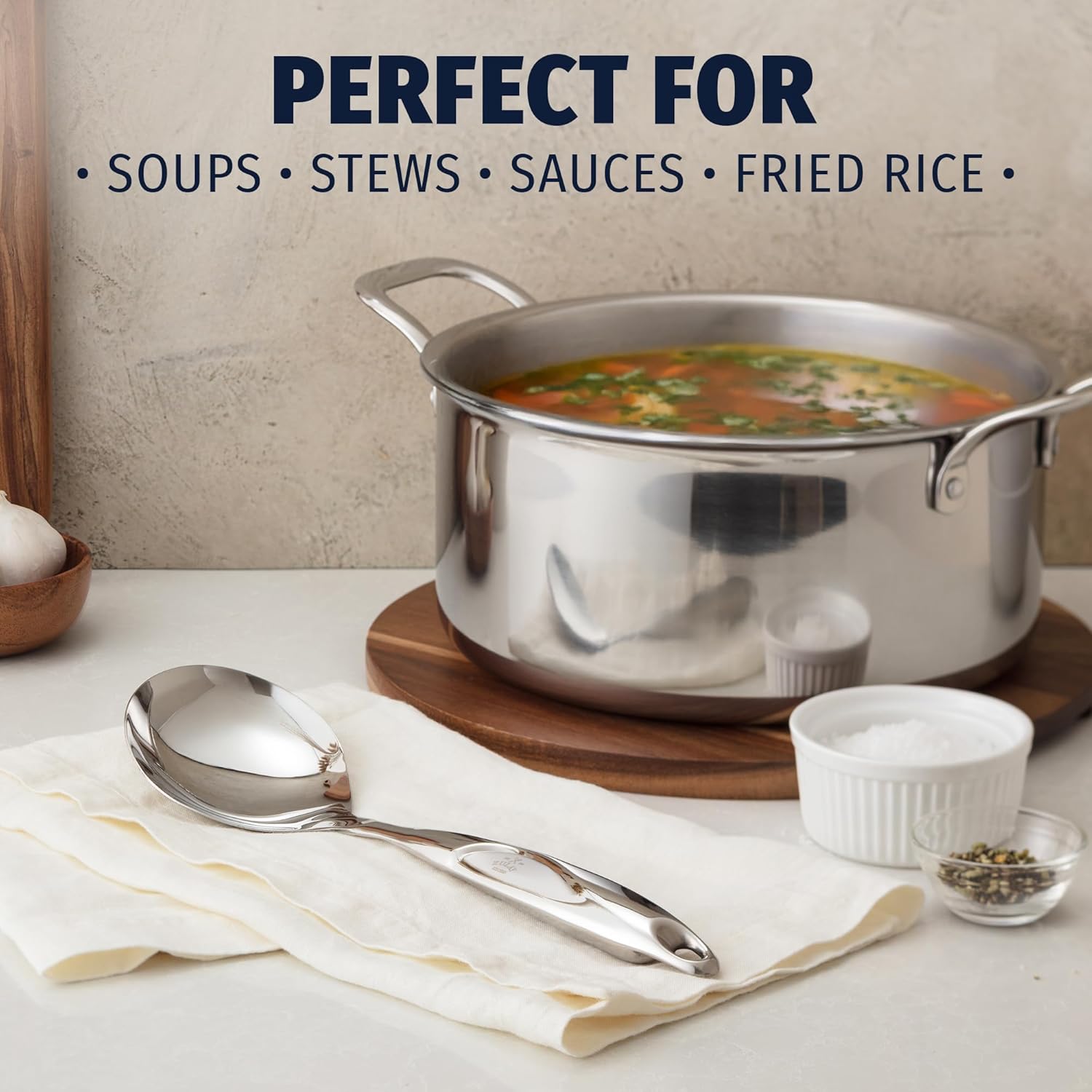 - STURDY STAINLESS STEEL: From an intimate family dinner at home to a large gathering in your backyard, the Zulay Kitchen Serving Spoon has got you covered! Made with top-grade stainless steel that is durable, sturdy, and long-lasting. Its polished mirror finish provides a smooth texture with no rough edges giving this tool an elegant look that matches any kitchen utensil set.