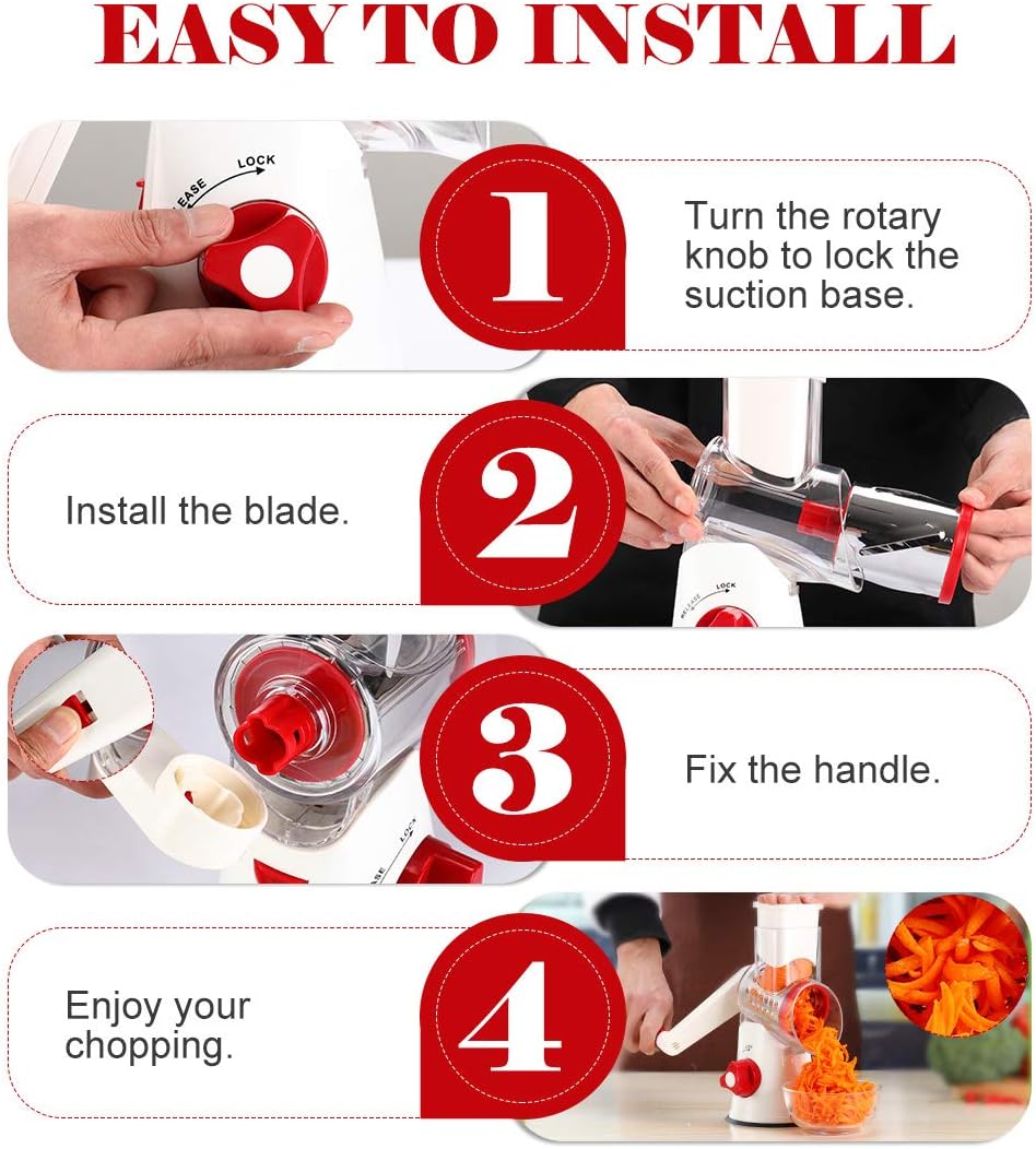 - Three blades for various kitchen needs: slicing, coarse shredding and fine shredding. The rotary grater is ideal for grating cheese, potato, carrot, cucumber, radish, nuts, chocolate, broccoli, etc. for pizza tops, cauliflower rice, hash brown and so on