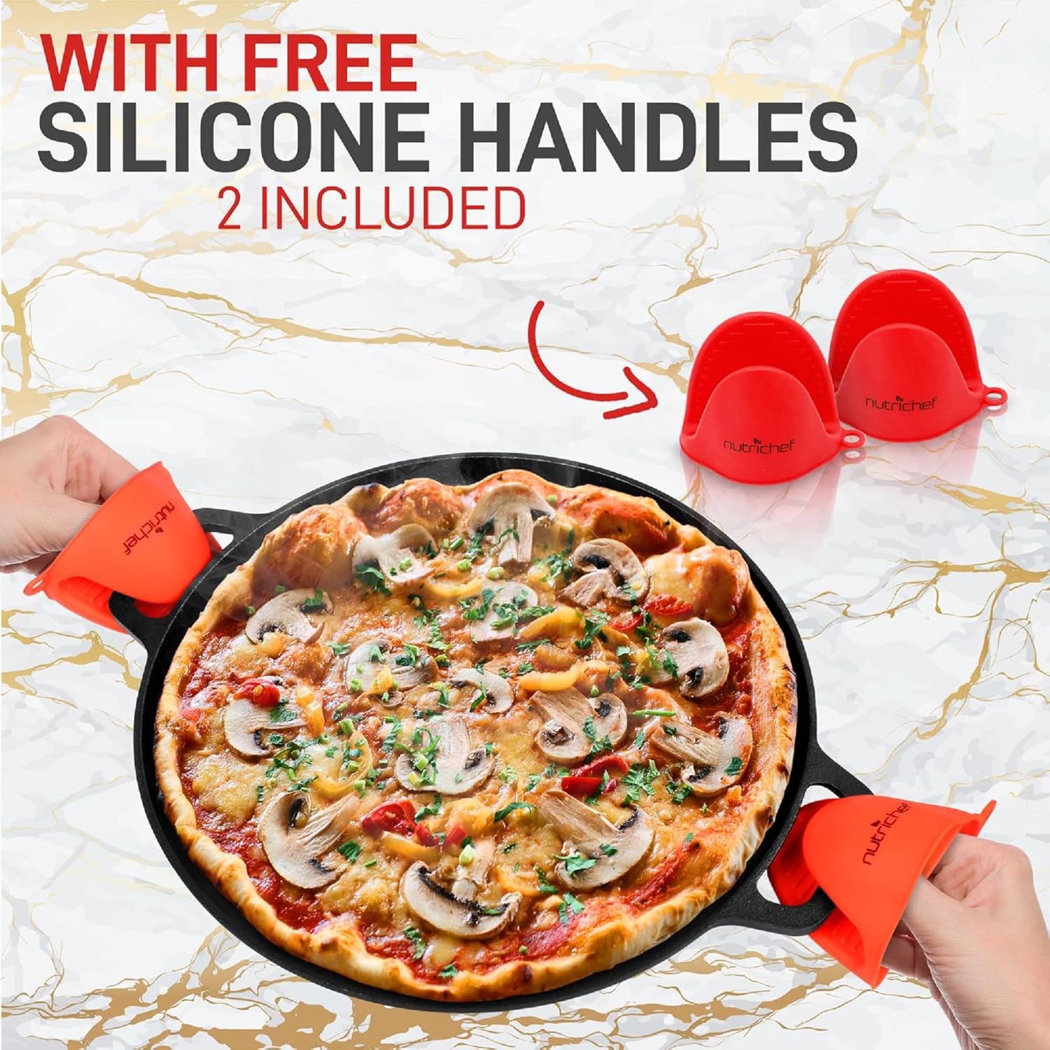 - HEAT SAFE UP TO 500° F: NutriChef pre seasoned cast iron pizza pans are heat-safe at high temperatures up to 500°F (260°C). Features wide diameter size for large meals & includes 2 orange silicone handles. Also ideal for chicken, steak & veggies