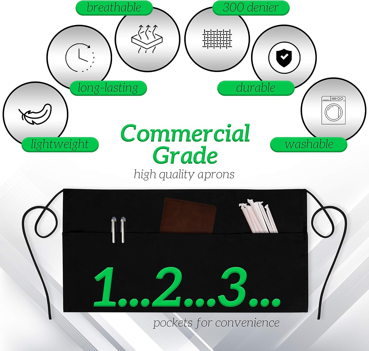 - 3 Pack Black Waist Aprons For Men And Women: The GREEN LIFESTYLE half apron for waiters and waitresses is made of commercial grade 100% Spun Polyester fabric to offer a durable, tough, tear-resistant and stain-resistant surface. Each aprons with pockets is specifically made to meet industrial grade standards so it is made to last and Machine Washable and will last you!