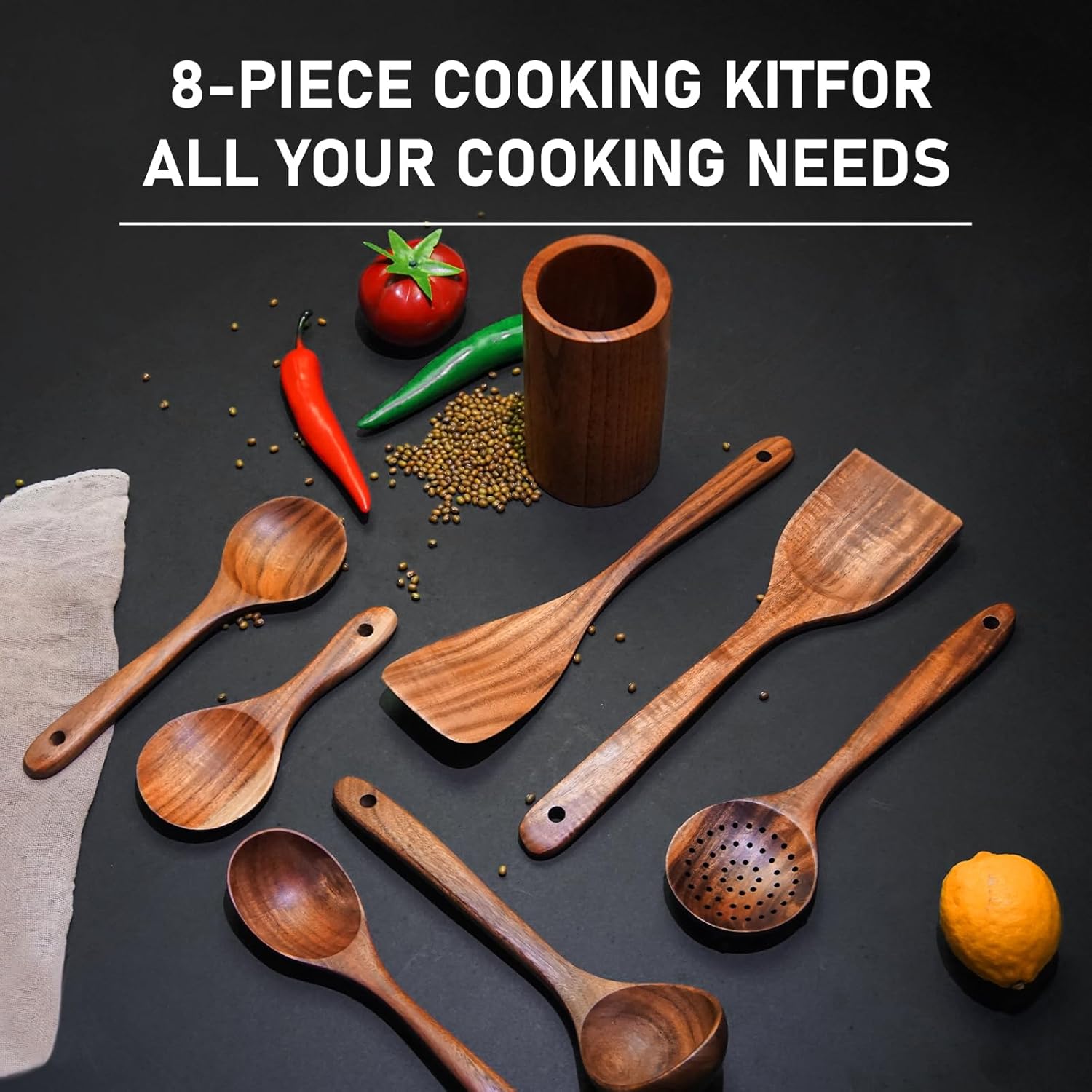 - [8 PCS Wooden Kitchen Utensil Set]: Embrace convenience and versatility with our 8pcs wooden cooking utensil set, carefully curated to cater to all your kitchen needs.With this set at your disposal, you'll effortlessly conquer every culinary challenge