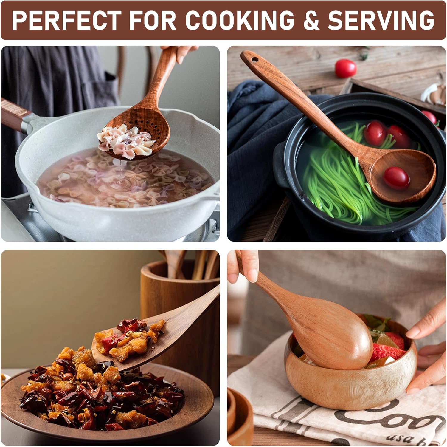 - [Wooden Cooking Tools for Non-stick Cookware]:Our robust teak kitchen cooking set, specially designed to withstand high temperatures without compromise.Their gentle wood material prevents scratching on expensive non-stick pans, safeguarding your cookware