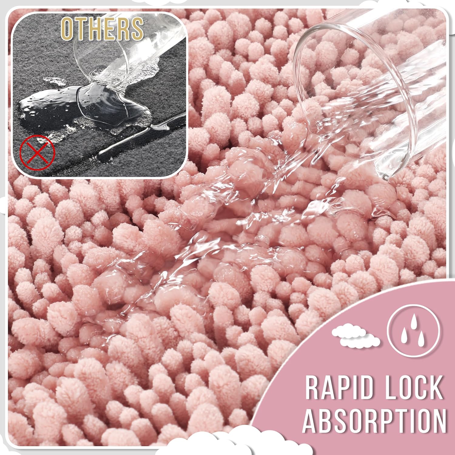 - Massive Water Absorption in Seconds: 5X faster than other materials mats, Yimobra bath mat absorbs 1000ml of water in 3 seconds. The vertical fiber channels lock moisture away from the surface, keeping your bathroom floor dry and discouraging damp environments. Perfect as a shower exit guard or sink splash catcher