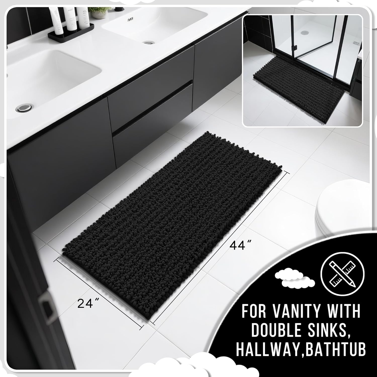 Yimobra Long Bathroom Rugs Non Slip Washable 44x24 Inch - Ultra Soft Absorbent Chenille Bath Mat, Quick Dry Shaggy Floor Carpet for Tub Shower, Black Home Decor Accessories