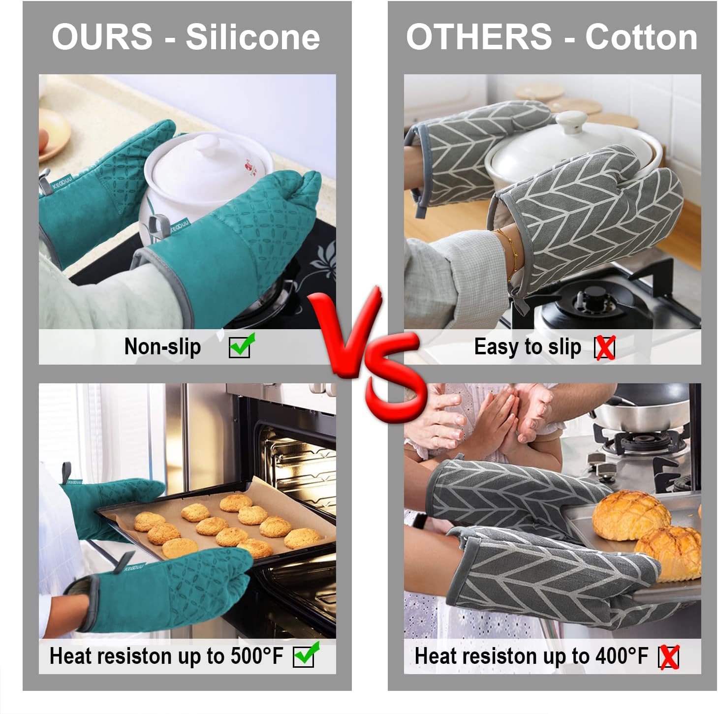 - 500Β°F HEAT RESISTANT &NON-SLIP - This oven mitts heat resistant 500 degrees because of the durable construction so it can effectively keep you protected from burning while you enjoy cooking and grilling. Enhanced with anti-slip silicone design to provide a more robust, non-slip grip that can be held securely when handling the kitchen utensils