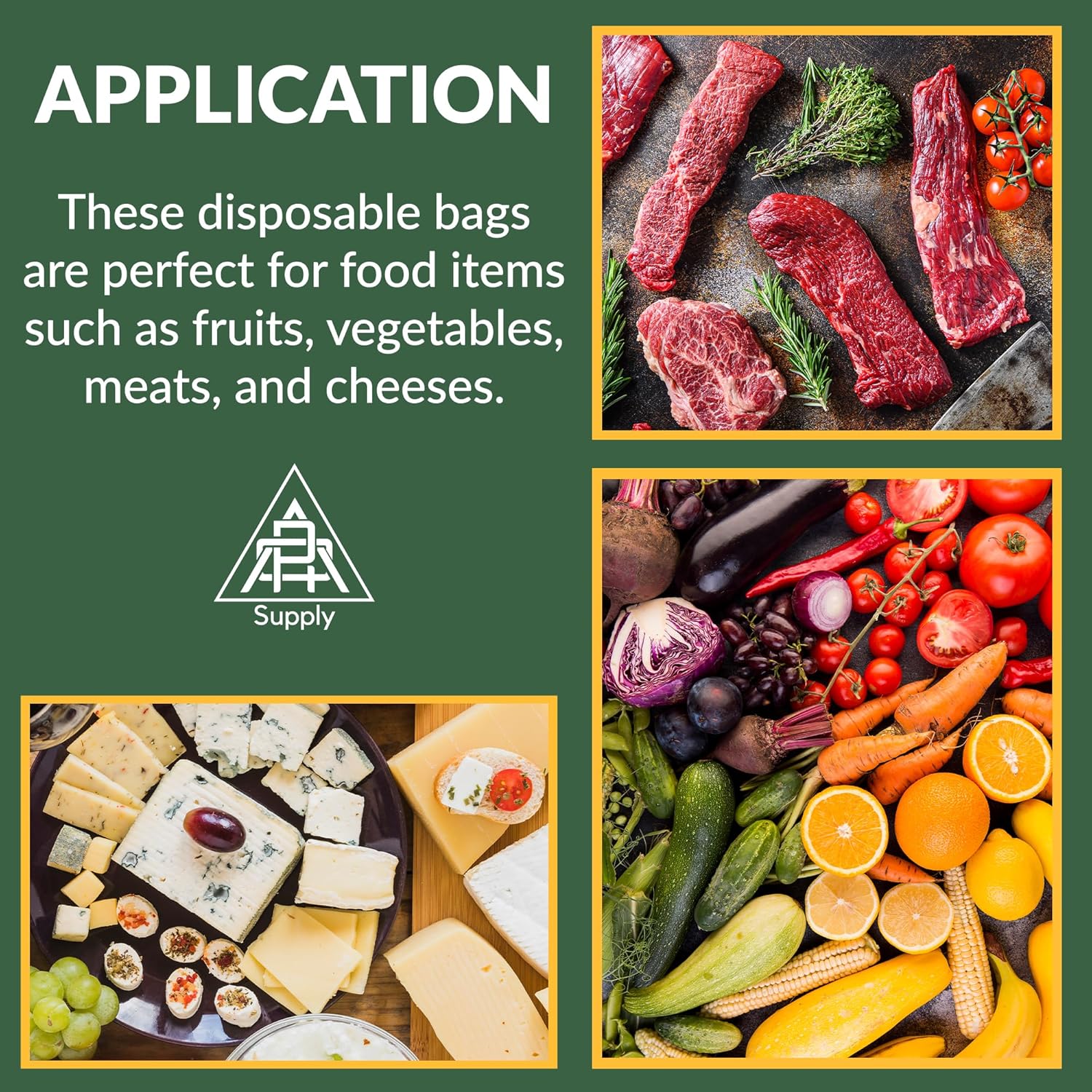 - Application. Disposable plastic bags are great for hanging produce and are suitable for fruits, vegetables, meats, and cheeses; can also use plastic bags for lightweight items in gift shops or antique stores. Great for food and for use as grocery store produce bags and farmers' market bags.