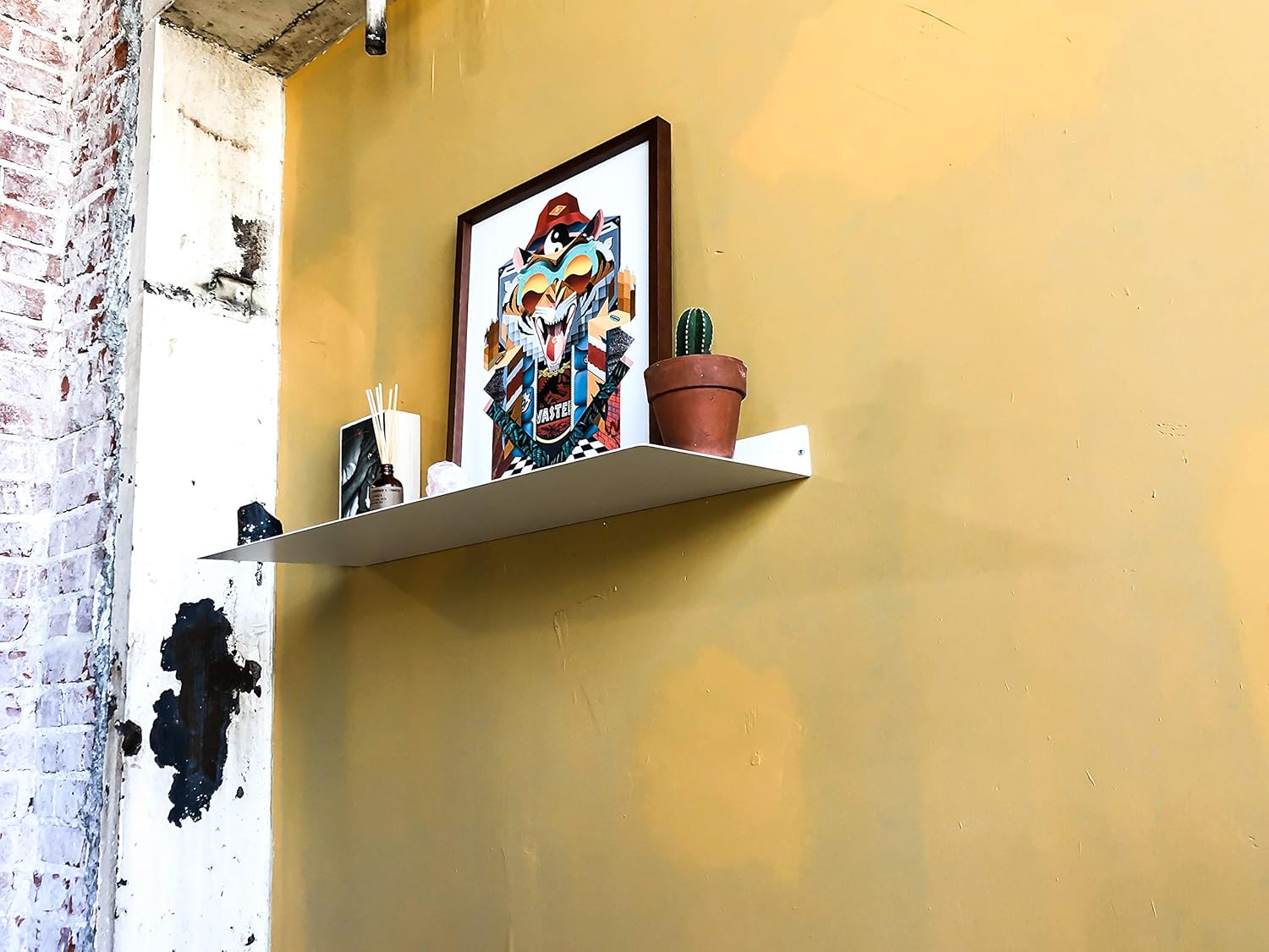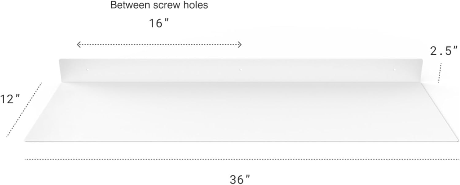 - DIMENSIONS & DETAILS: Measuring 36-inches long x 12-inches in depth, our steel floating shelf is made from 14 gauge raw steel and professionally powder coated white. The weight of the shelf is 11 LBS. It's perfect for displaying books, plants, bottles, picture ledges, and retail displays