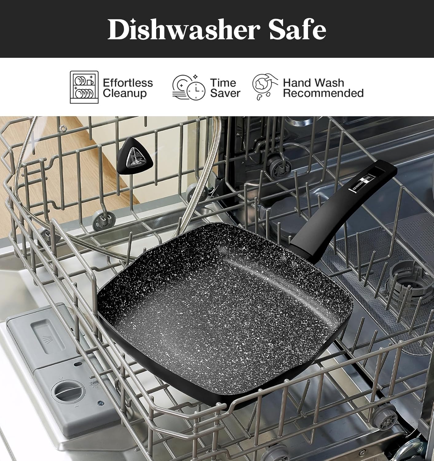 - Fast Heated - Break resistant & does not warp, conducts heats quickly & evenly, the thickened magnetic bottom is compatible to provide a stable heat distribution and rapidly heating up, saves time and energy, It ensures uniform heat dissipation and prevent hot spots. The grill pan is compatible for gas, ceramic, electric, halogen or induction stoves. Oven and dishwasher are not applicable.