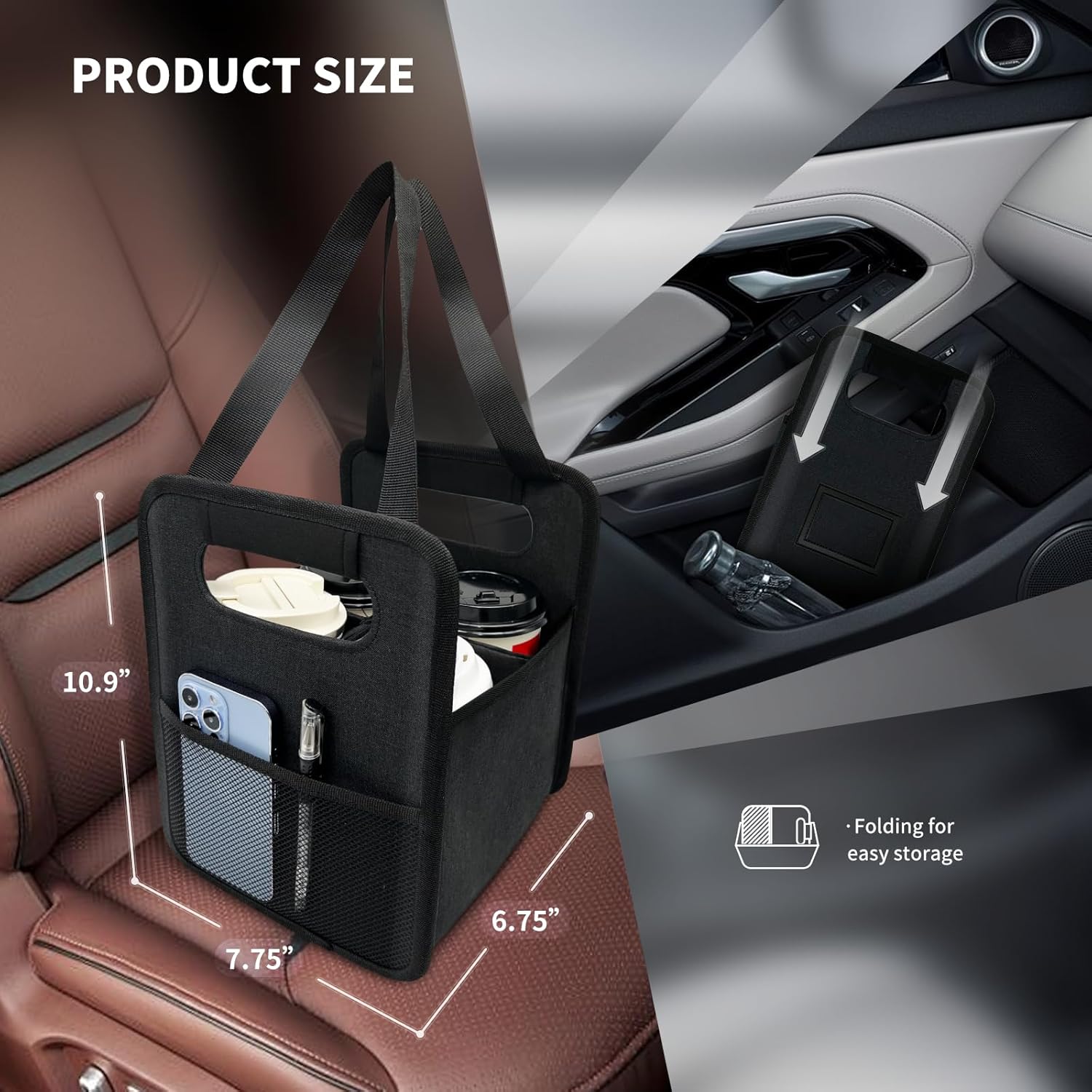 Reusable 4 Cup Drink Carrier with Handle and Adjustable Dividers, Insulated Caddy for Take Out, Foldable Coffee Cup Holder for Hot & Cold Drinks (Black)