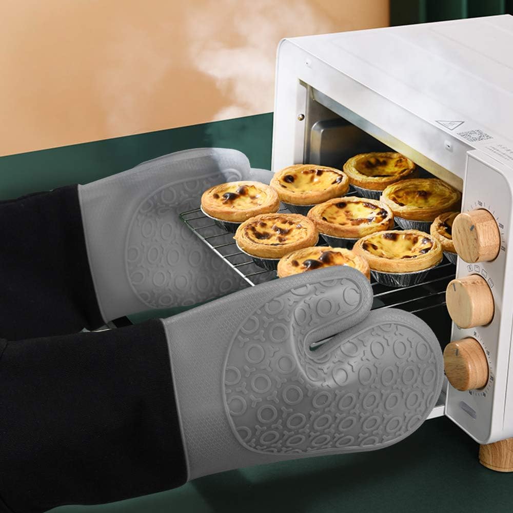 - Premium Materials: The oven mitts consist of 2 layers of materials. First layer non-slip textured silicone withstand high heat up to 500 Fahrenheit. Second layer polyester cotton for double protection & comfortable. Perfect for grilling, cooking & baking.