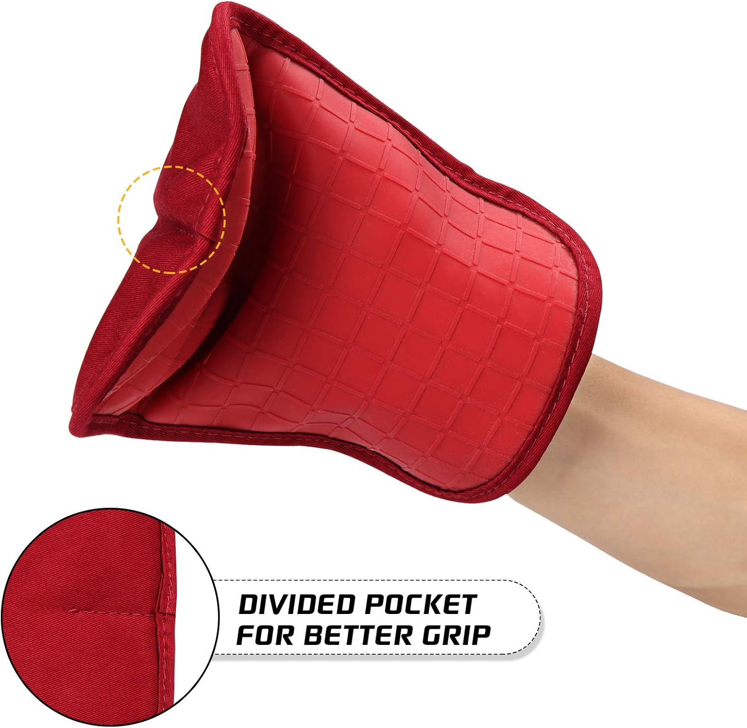 - Improved Control with Non-Slip Grip β We designed our pot holders and oven mitts with a split or divided pocket at the fingertips and a non-slip silicone pattern to give you better flexibility and control when picking up or moving kitchen items.