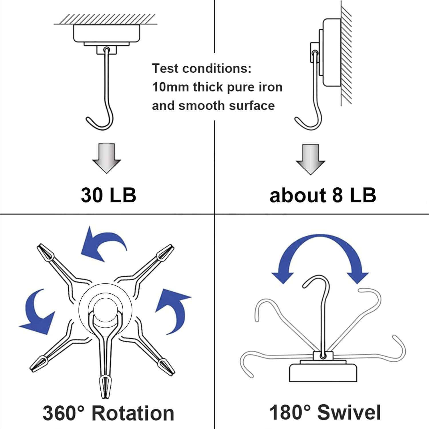 - 【Friendly Reminder】:The maximum bearing capacity of the magnet hook is about 30LBS in the vertical direction and 10LBS in the horizontal direction. The bearing capacity of the black magnet hook is affected by the smooth and flat contact surface.