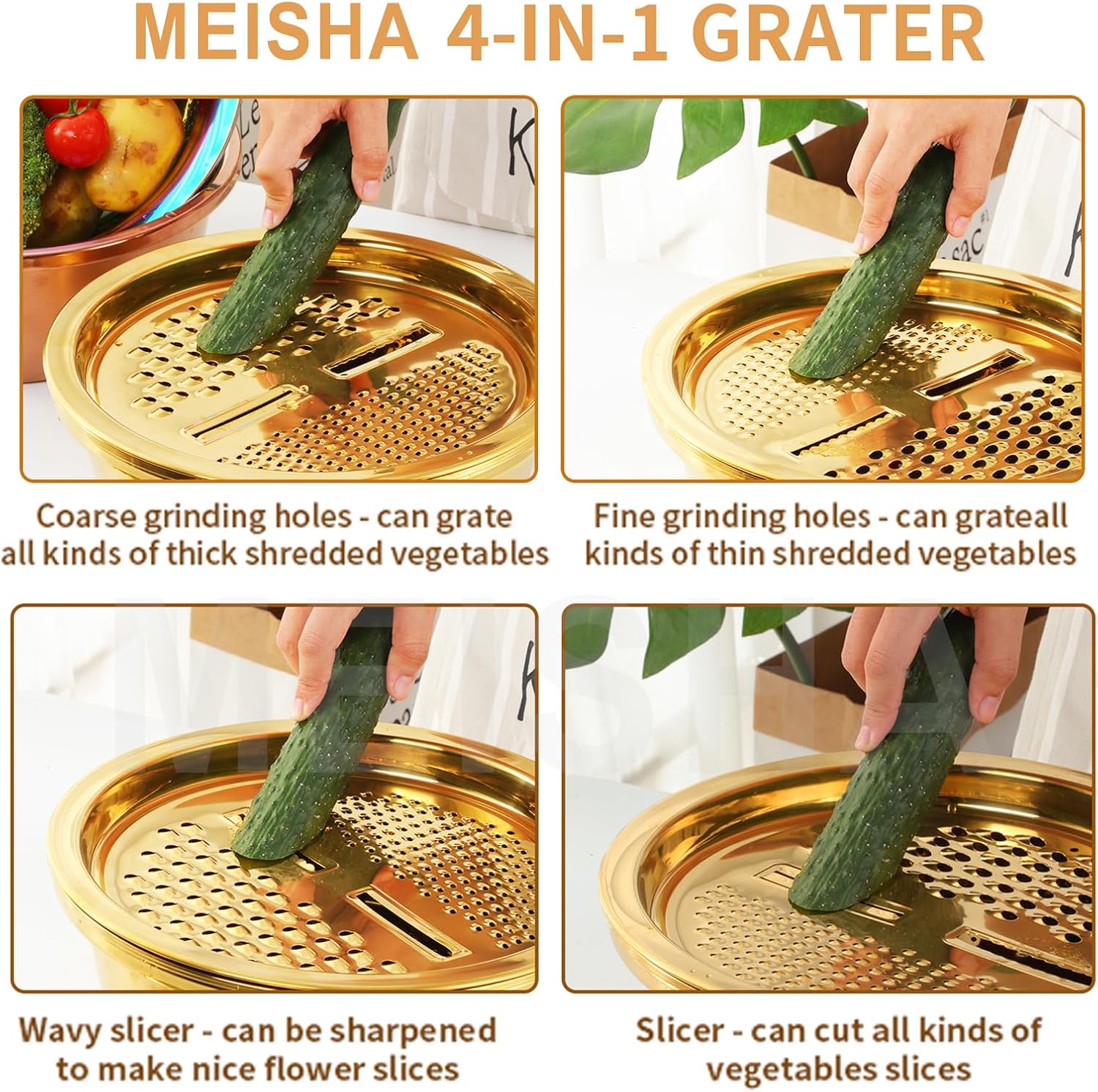 Meisha Colander, 3Pcs Stainless Steel Kitchen Tool 3 in 1 Drain Basket Fruit and Vegetable Cutter Strainer Bowl Set Drain Pot Basket Grater for Fruits Vegetables Rice Washing Mixing - Gold