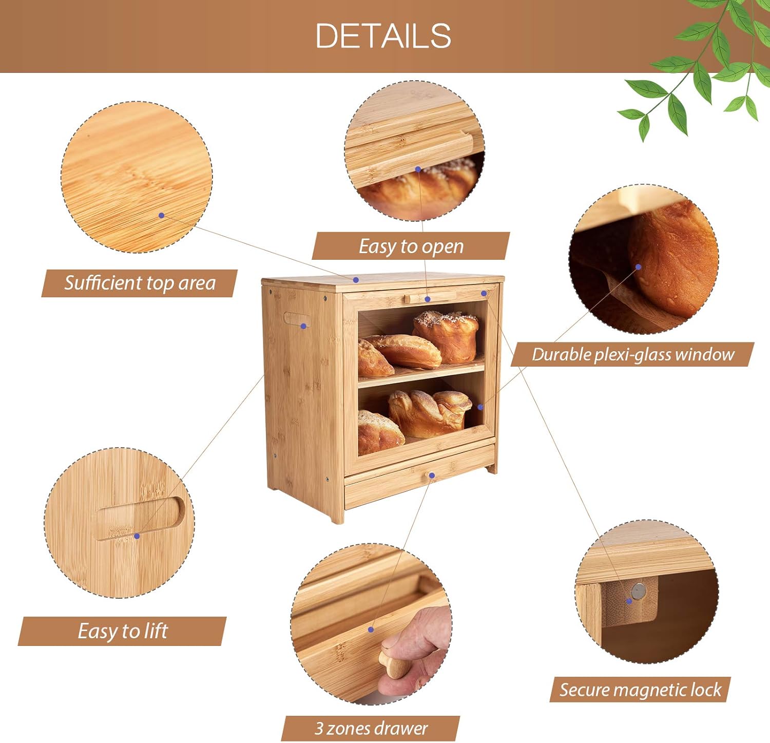 - [PRACTICAL DRAWER DESIGN]: This bamboo bread box includes a sliding drawer to hold toaster tongs, bread knives, or collect crumbs. Save money and space by eliminating the need for extra organizers with this versatile breadbox for kitchen countertops and bread boxes for kitchen counter. this versatile breadbox for kitchen countertops and bread boxes for kitchen counter.