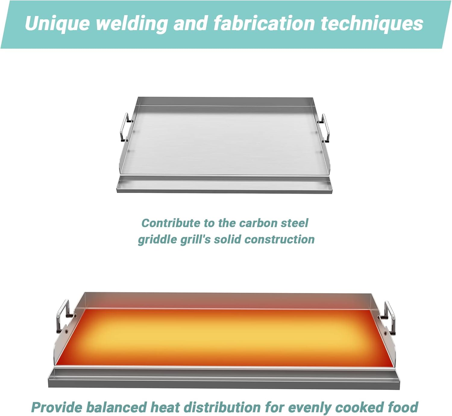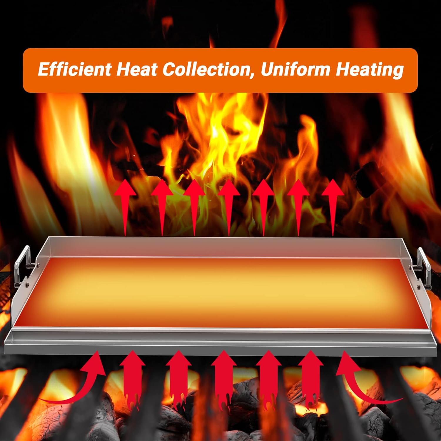 - THE X-SHAPED BACK ENABLE HEAT EVENLY - Our essential griddle stove plate underside cross-bracing promotes even heating, the raised baffle (1.3βH) can prevent oil spilling over and food splashing, and side foldable handles is sturdy and can easily lifting the plate on and off easily.