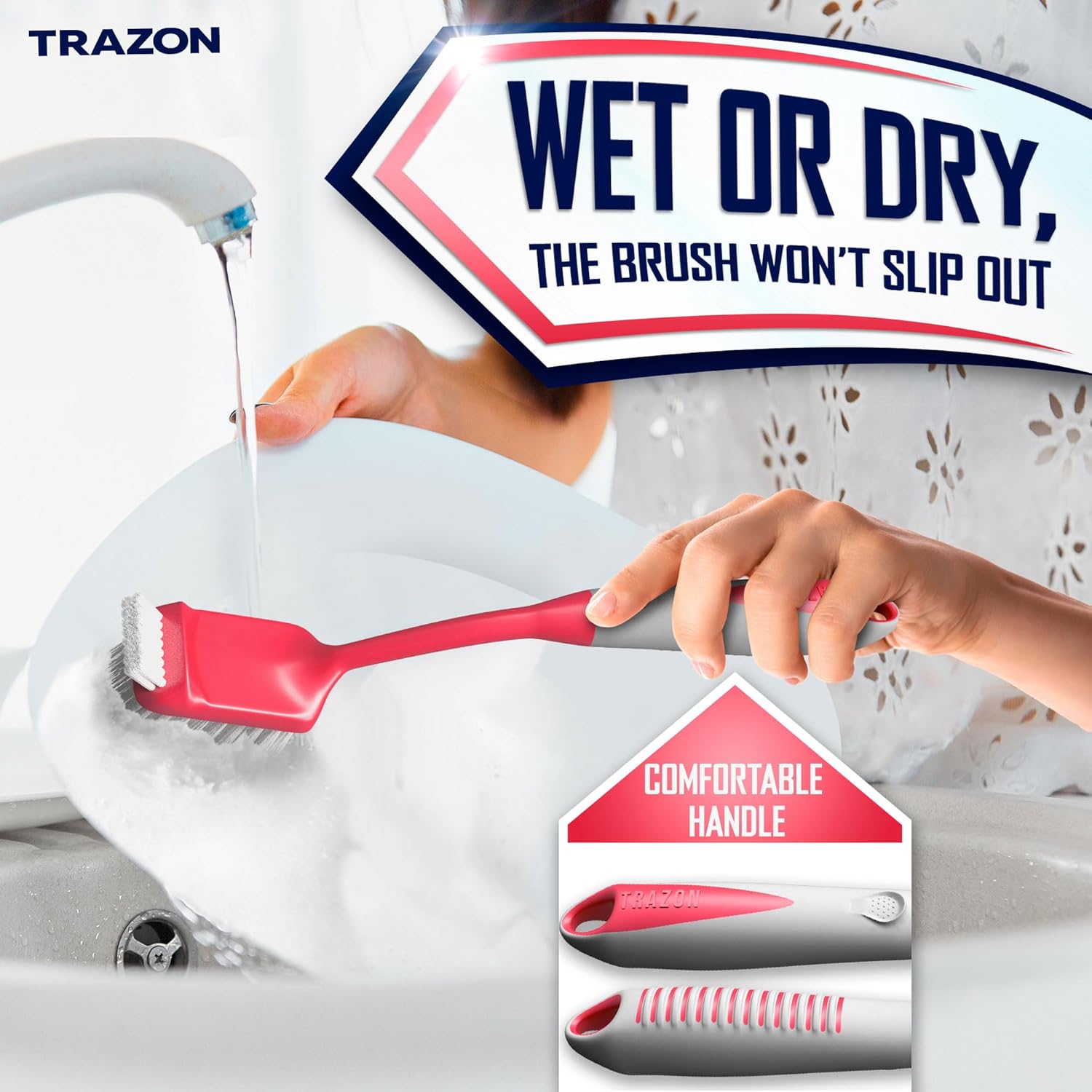 Dish Brush Set of 4 - Kitchen Scrub Brushes with Non-Slip Long Handle for Cleaning, Scrubber, Dishwashing, Dishes, Bottles, Straws, Cups, Pots & Sink, Red