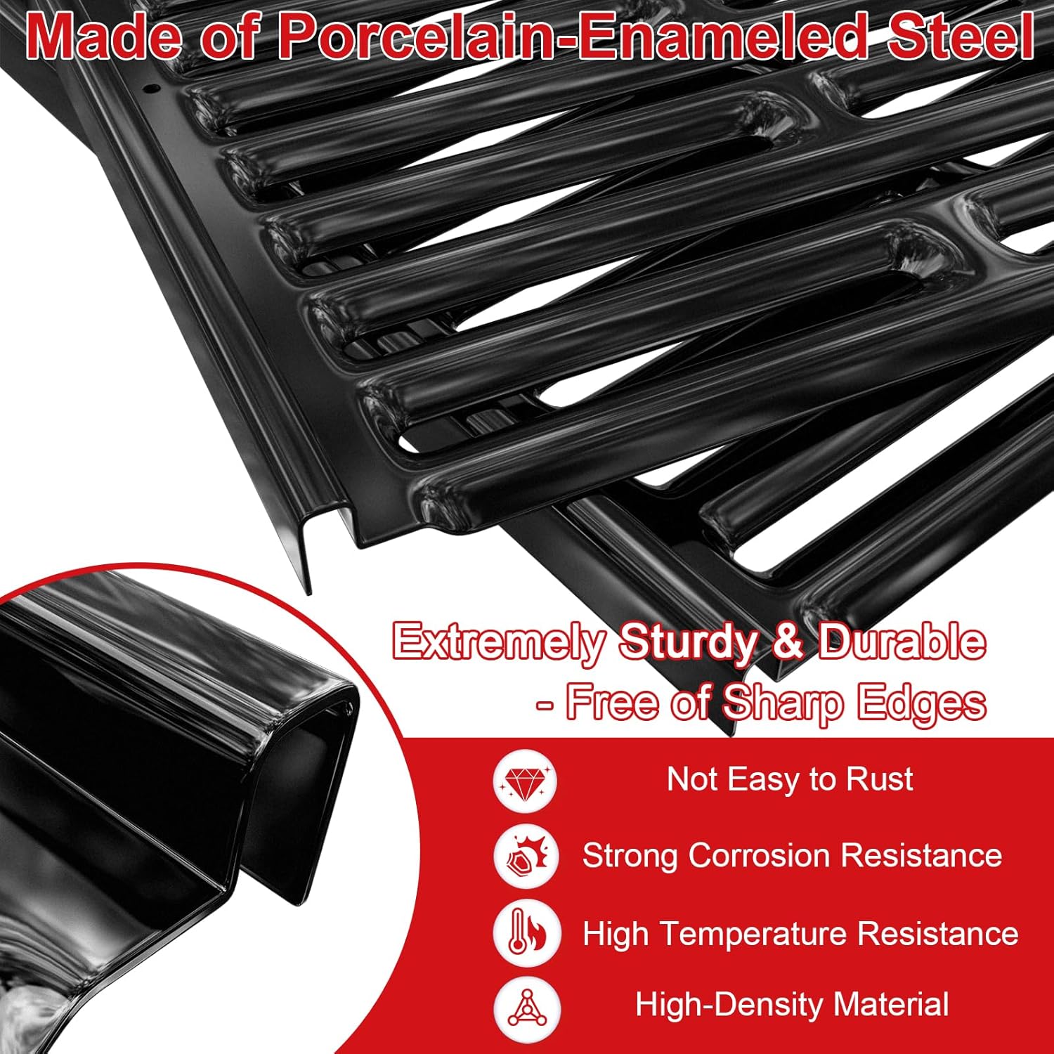 - 【Includes】Set of 2 durable grill grates. Enough sturdy for long-term use. The Porcelain-enameled finish keeps food from sticking and distributes heat evenly at high grilling temperatures. Evenly heat and retain superbly, provide professional sear.