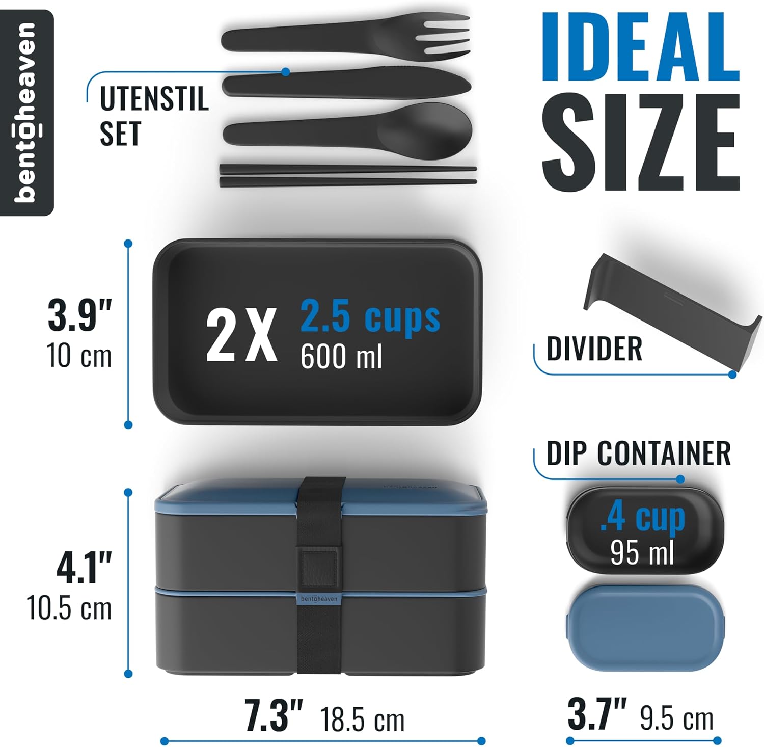- Your meals deserve a Premium Bento Box! It features 2 stackable compartments that hold 40 oz., 2 silicone sealed lids, divider, dip container, chopsticks, fork, spoon, knife, and a sealing strap.
