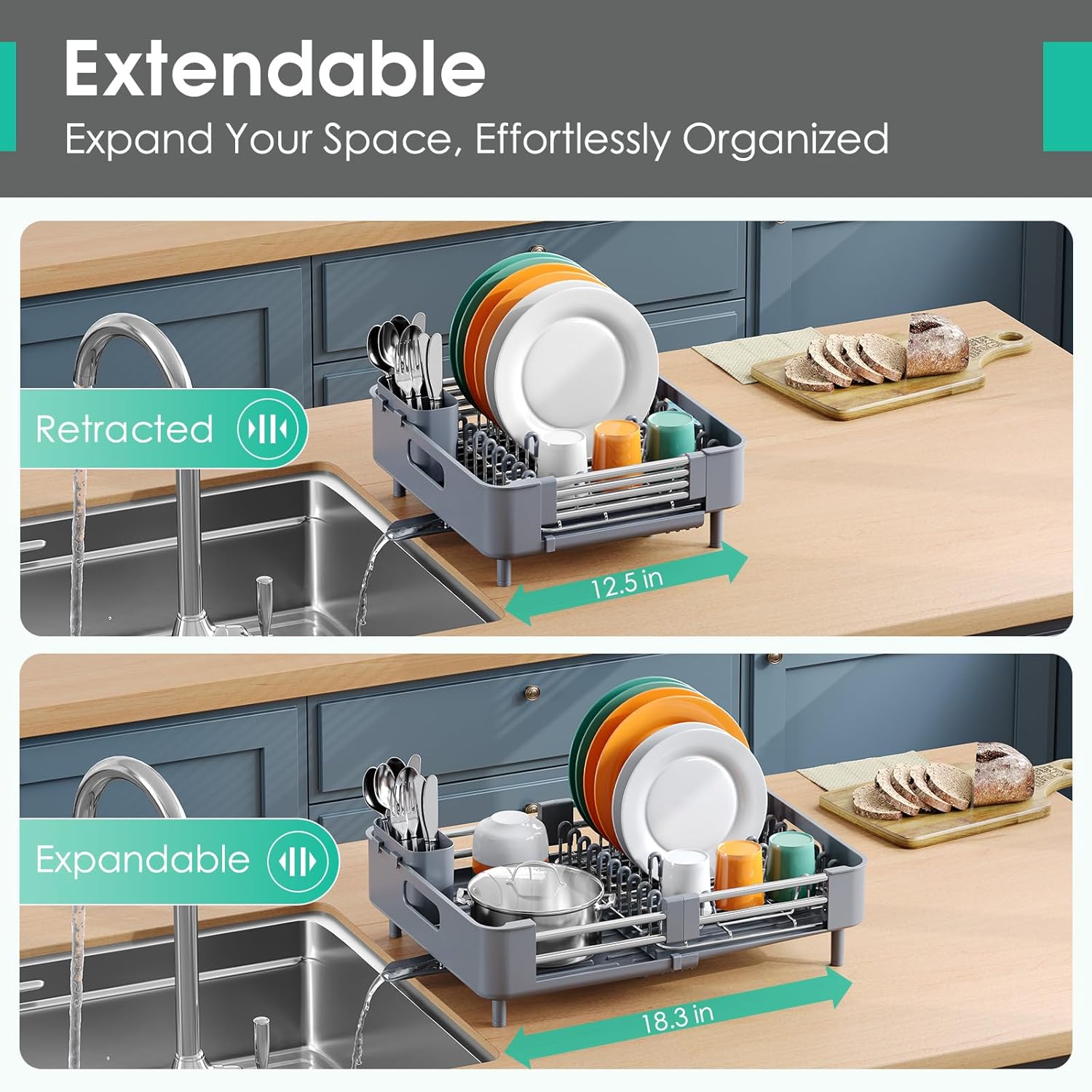 Dish Drying Rack for Kitchen Counter, Extendable Dish Rack with Drainboard, Expandable Dish Drainer, Collapsible Dish Strainer with Cutlery Holder, Foldable Home Countertop Plate Storage Rack, Gray