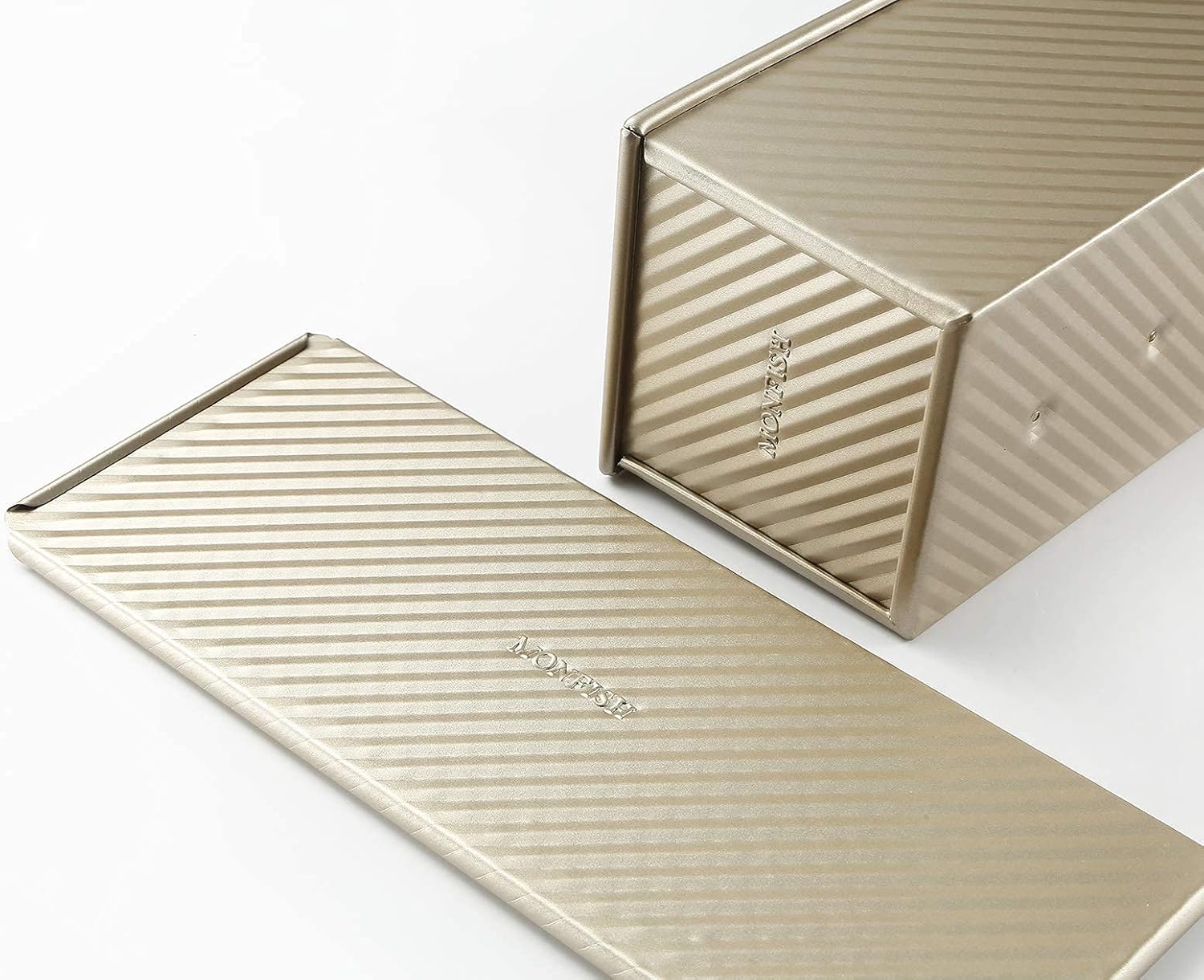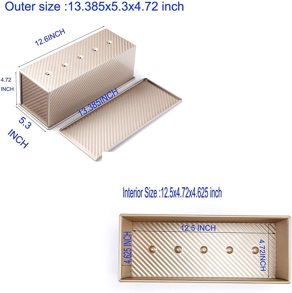- STYLISH WAY TO BAKE - Complement the overall theme of your kitchen with this elegant 13.5x5.5x4.75 inch pullman pan. It features a nice champagne gold color that will blend naturally with the rest of your bakeware.The big size suits for 4-8 people family.