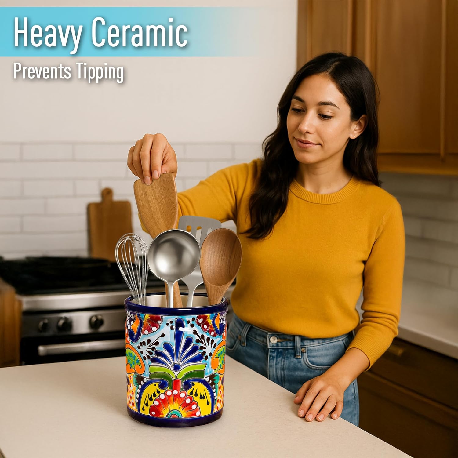 - Use our utensil crock to store your spatulas, ladles, rolling pins and long-handle spoons of all types. It makes the perfect kitchen tool holder. Our best-selling utensil jar makes the perfect gift for the chef, fiesta party decor, home cook, food lover, Mexico lover, gift for mom or anyone who loves unique and high-quality decor. Our clients tell us these make the perfect housewarming and wedding gifts as well for the newlywed couple buying a new home.