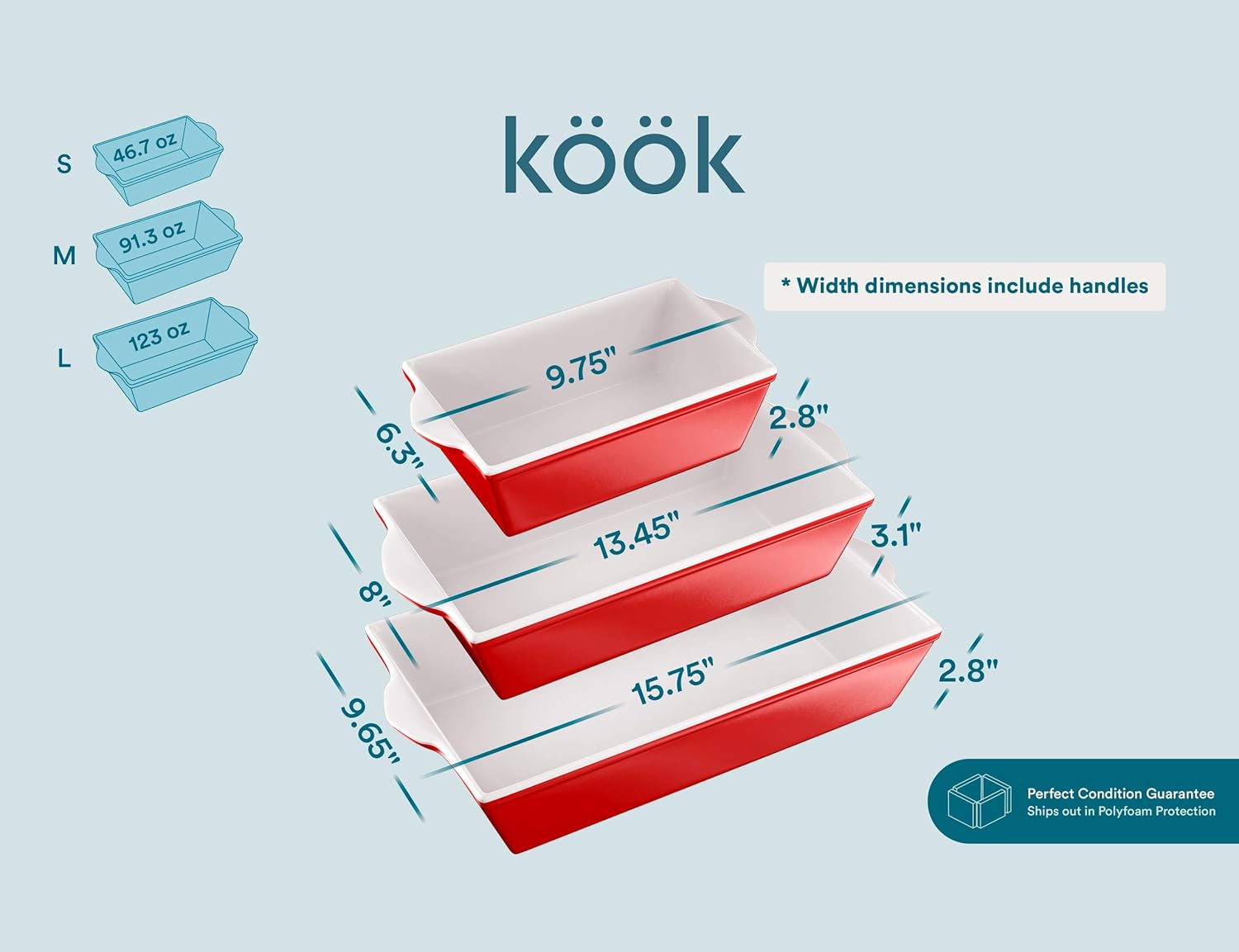 - The Kook Promise: To guarantee that these baking dishes arrive in ideal shape, we've carefully packed them in unique polyfoam molds
