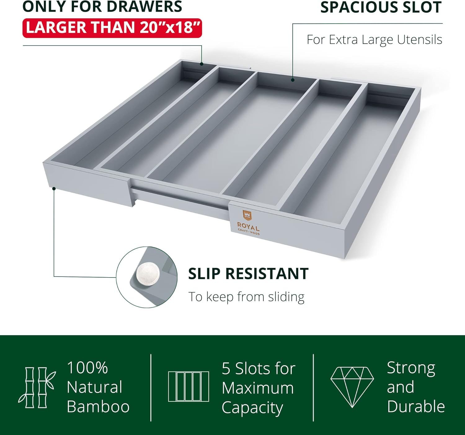 - π πππππππ ππππ ππππππ πππ πππ ππππππππ: Please be aware that the Royal Craft Wood Silverware Organizer is a bit deeper and larger than some kitchen drawers. We kindly ask that you MEASURE your home drawer prior to purchase to ensure that this product is a good fit. Please ensure that your drawer space intended to be used with the drawer organizer is LARGER than 20x18β wide for a guaranteed, comfortable fit when fully expanded