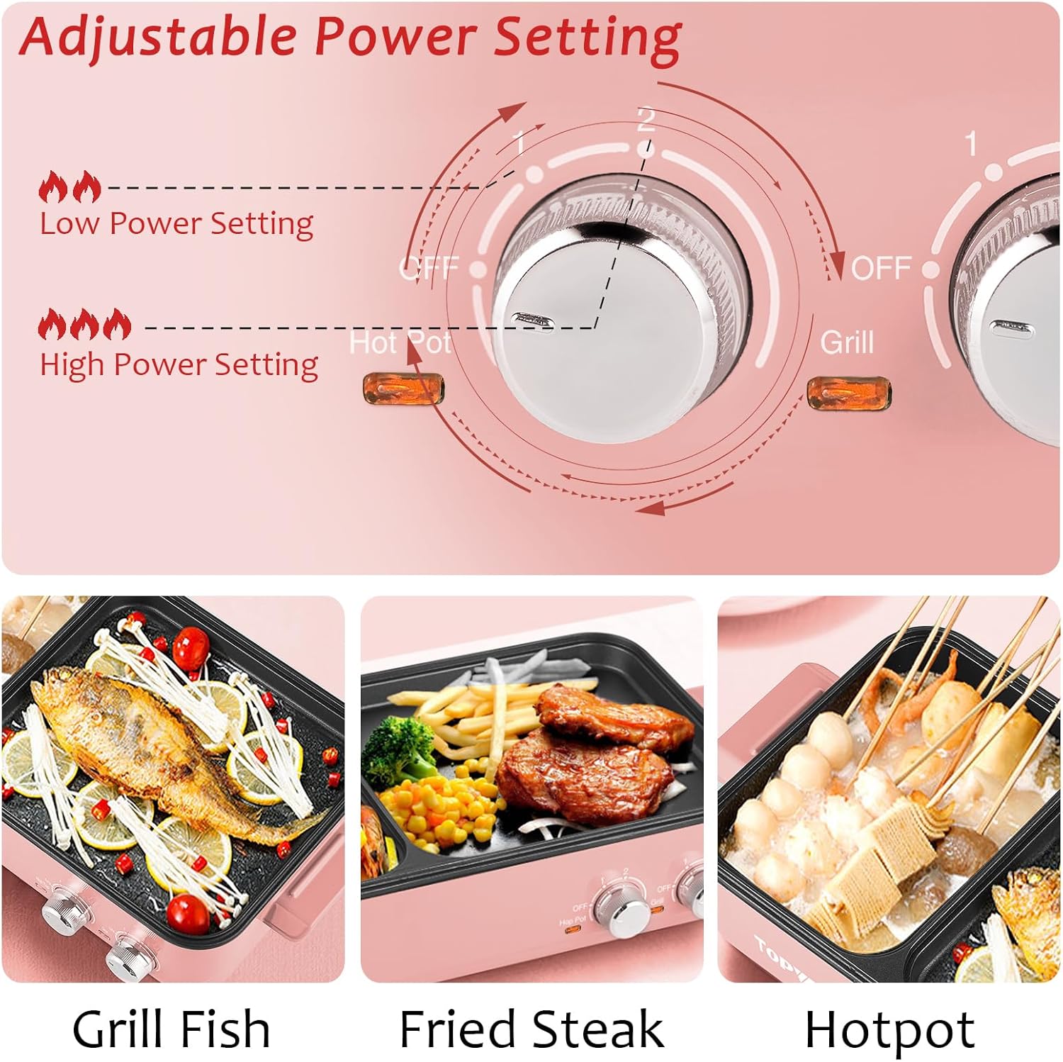 - 【Separate Dual Temperature Control】Topwit hot pot grill combo have a separated temperature control and the Maximum power for each is 600W, high thermal efficiency and fast heating. When the electric grill and hot pot is working at the low power setting, the power is 300W. With this innovative design, you can make noodles and steaks in the meantime