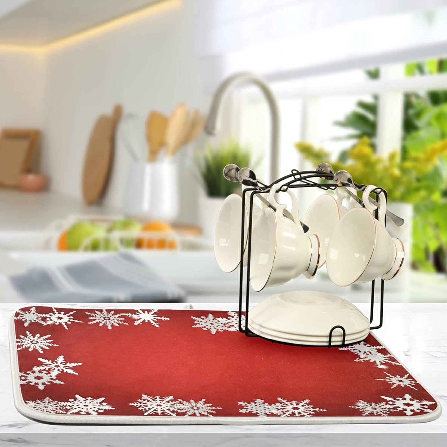Super Absorbent Dish Drying Mat, Microfiber Fast-Drying Dish Mat, 16" x 18", Kitchen Dish Drying Pad, Watercolor Cute (Christmas Snowflake Abstract)
