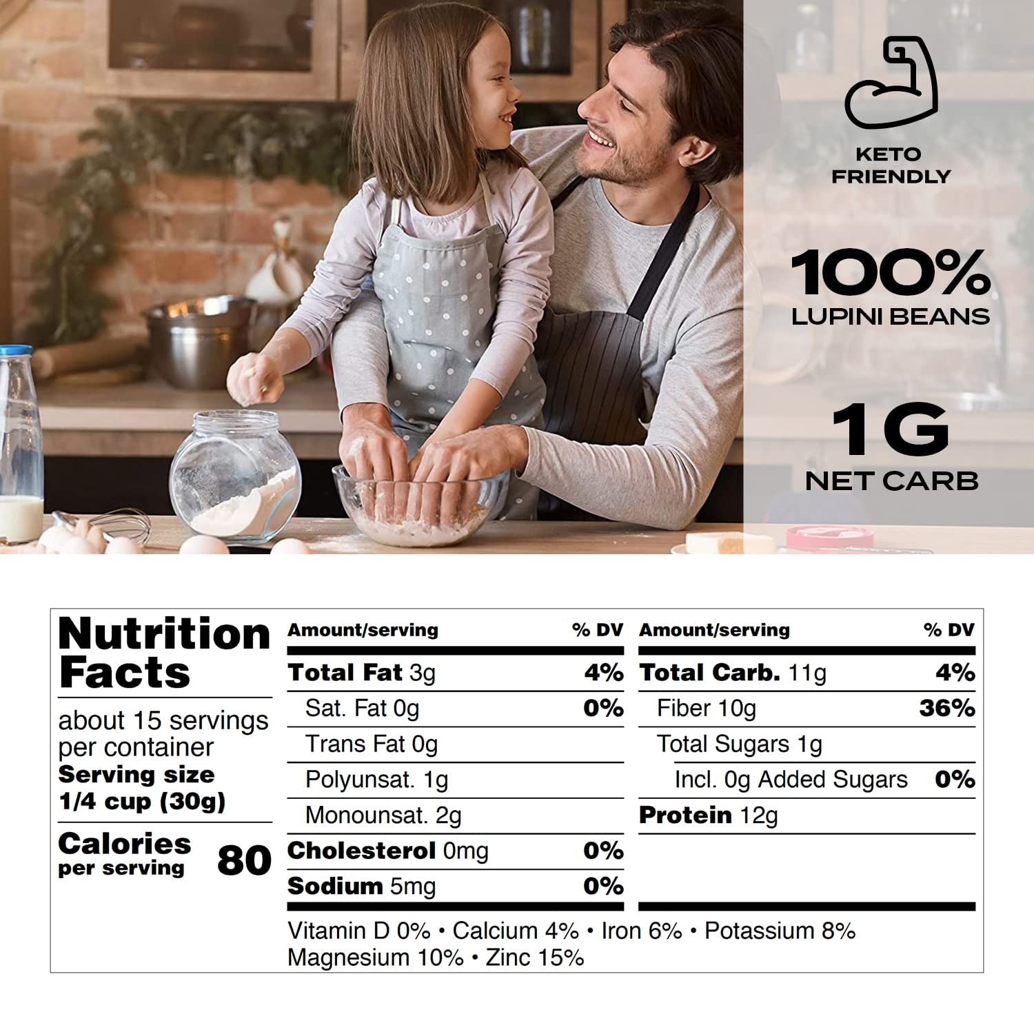 - ππππ & πππππ π πππππππ β Lupini flour is perfect for those following a low-carb or vegan diet. Enjoy traditional recipes while achieving your nutritional goals! In one serving size of Lupin Flour you will be getting 36% of your daily fiber as well as 10% of your daily Magnesium, perfect for a Keto or Vegan diet! This includes ZERO grams of added sugars. This flour has 3X the potassium of bananas, 2X the iron of kale and 7X the fiber of orzo!