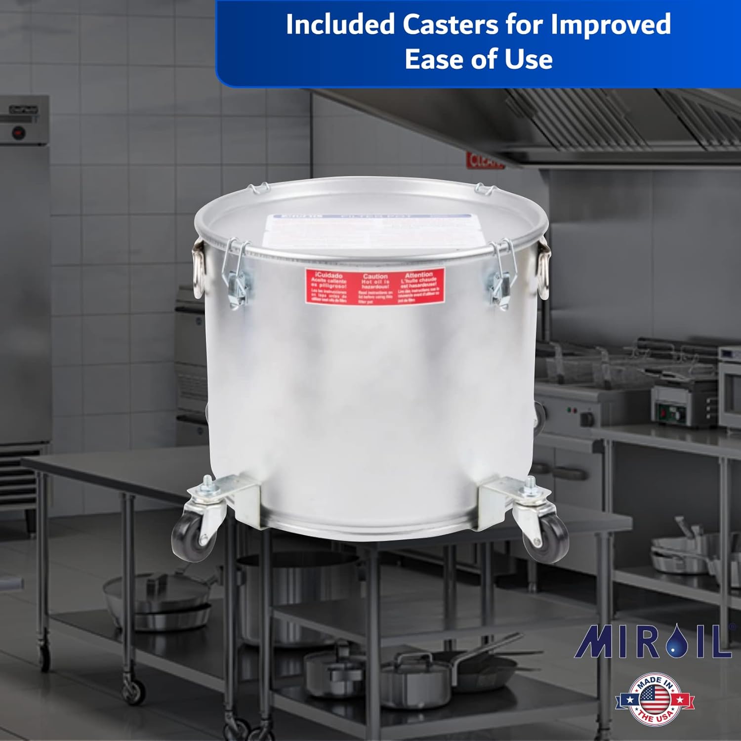 - HEAVY-DUTY STEEL OIL PAIL CADDY WITH CASTERS FOR EASY MOBILITY β The MirOil 40LC Oil Utility Pail is built with heavy-duty steel construction and a durable enameled exterior, making it a long-lasting solution for safely storing and transporting used cooking oil and food products. Designed for convenience, this oil disposal container features smooth-rolling casters for effortless maneuverability in busy kitchen environments. Its low-profile design fits easily under fryer drain valves, while the easy-to-clean surface.