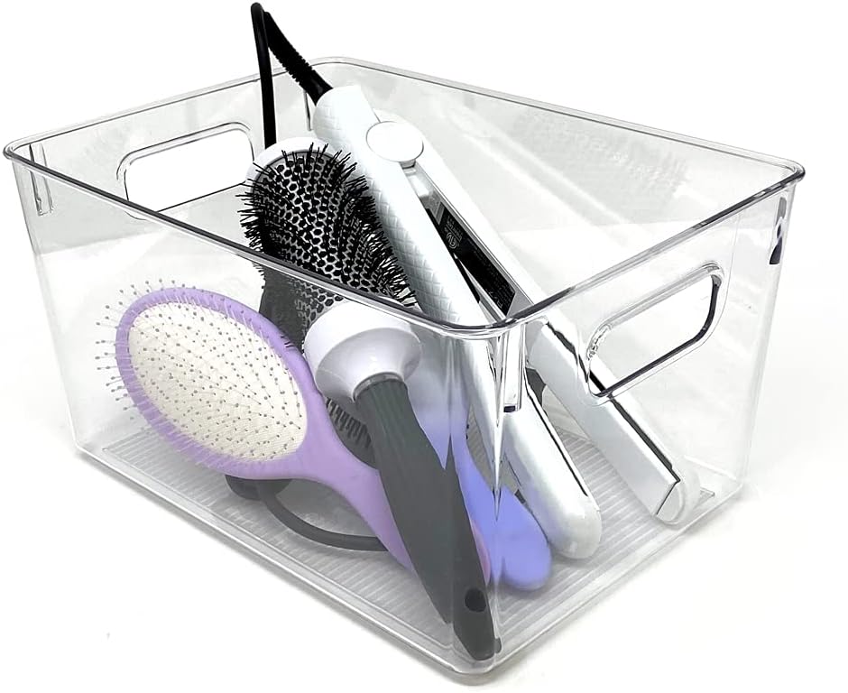 - NOT YOUR AVERAGE BIN: You’ll experience the difference in quality when you feel our modern bins. Each high-quality container has comfortable angled edges and is lightweight yet sturdy. The cutout handles make it easy to hold and carry, while the non-slip bottom helps keep the bin in place. Store your coolest items - from frozen veggies to your favorite shoes or heels (remember - double check your bin size first). The see-through bins are portable and can be stacked when not in use to save space.