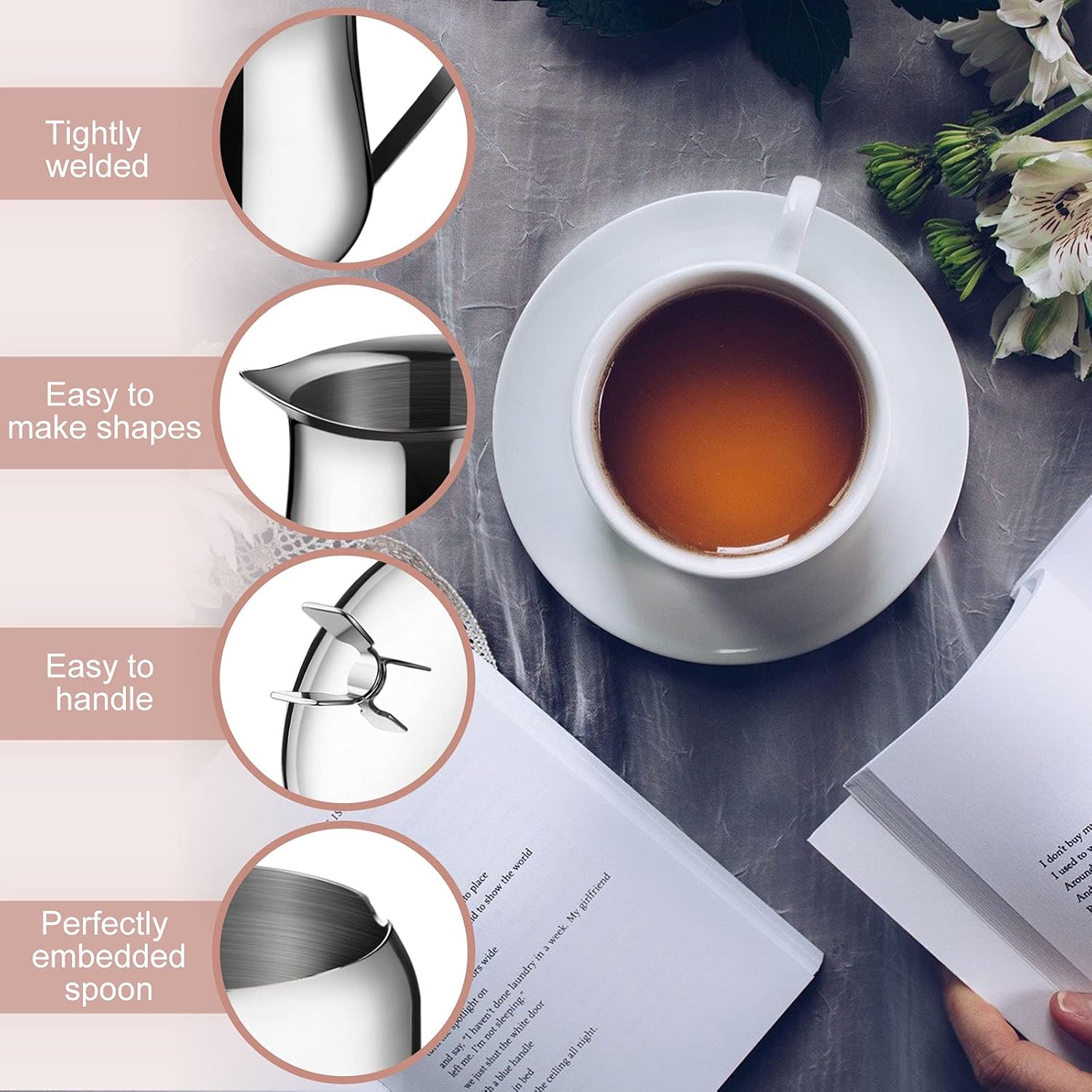 - Quality material: the set is made of stainless steel with thick texture, you can easily feel the temperature by touching it with your hands due to the temperature is very important for making fragrant milk foam; The shape is simple and beautiful, can be cleaned easily