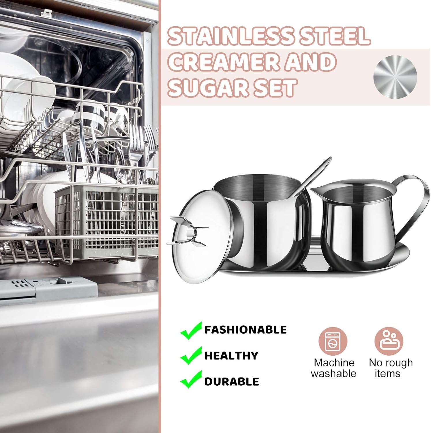 - Proper size: the height of the stainless steel milk tank is 6.5 cm/ 2.5 inch, the base diameter is about 4.5 cm/ 1.7 inch, the mouth diameter is 6 cm/ 2.3 inch, the length including the handle is about 10 cm/ 3.9 inch, and the capacity is 150 ml/ 5 oz; The height of the sugar bowl is 10 cm/ 3.9 inch, the diameter is 7.5 cm/ 2.9 inch, and the capacity is about 400 ml/ 13.5 oz; The tray is 18 cm/ 7 inch long and 8 cm/ 3.1 inch wide