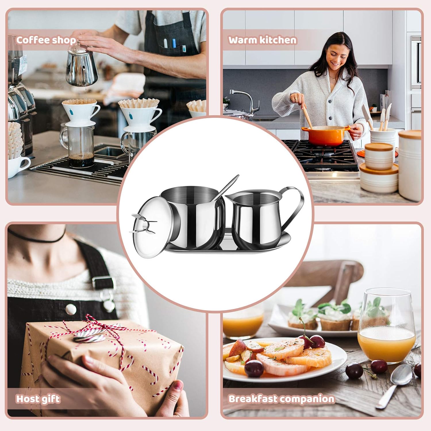 Creamer and Sugar Bowl Set Stainless Steel Latte Milk Cup Cream Jug and Sugar Bowl with Lid Spoon Tray for Coffee Serving Set Frothing Milk