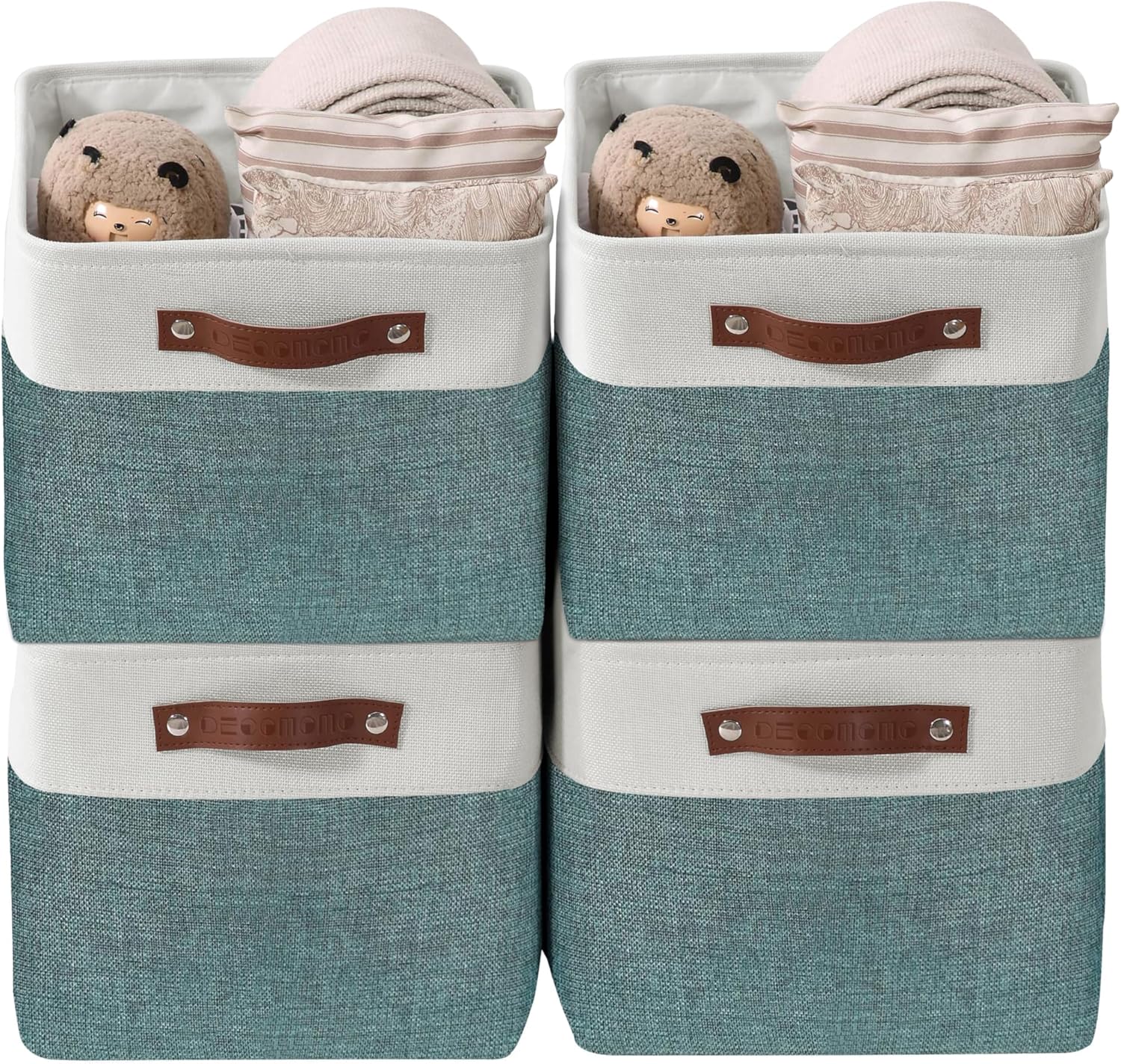 DECOMOMO Storage Baskets for Shelves - Fabric Storage Bins, Linen Closet Organizers and Storage (Green & White, Large - 4 Pack)