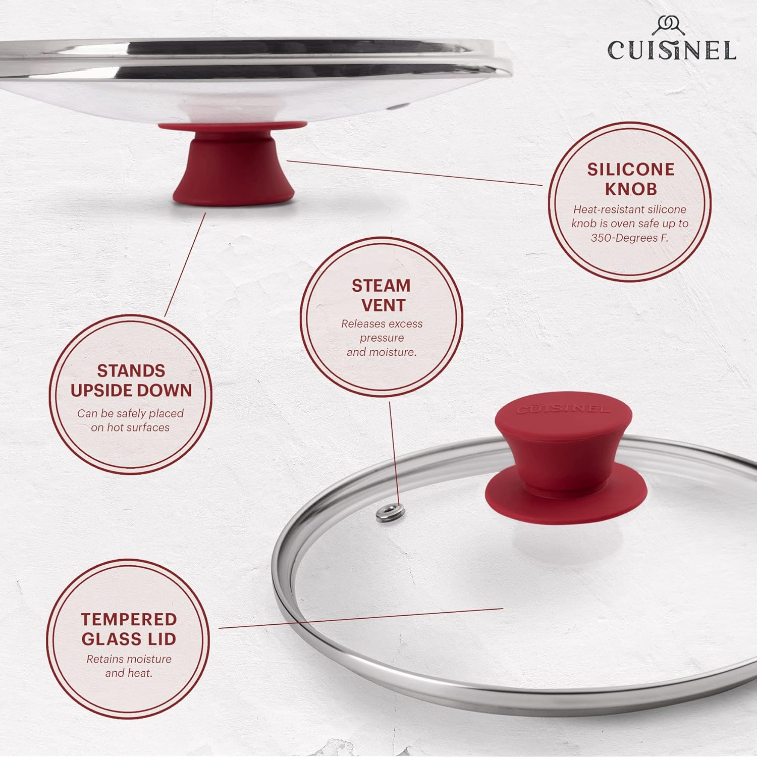 - STEAM VENT HOLE: Cuisinel's professional quality lids – now updated with steam vent holes to prevent liquid from boiling over. Vent holes allow just the right amount of moisture to evaporate easily so your food doesn't saturate in liquid. Vent holes make sure the glass lid doesn’t cloud up – allowing you to easily see cooking progress without removing lid.
