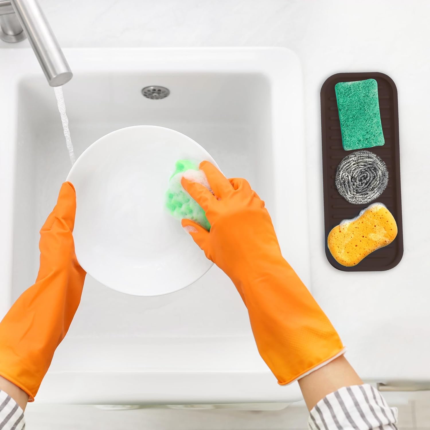 - MESS-FREE KITCHEN: Effortlessly keep your sink and kitchen countertop free from soapy residue with our sponge holder. With a size of 3.5 x 9 inches, this silicone tray is ideal for holding a cleaning sponge, brush, scrubbers, dish soap bottle, hand soap bar, and silverware. You can also use it in your utility rooms, bathroom, laundry area, and even your vanity.