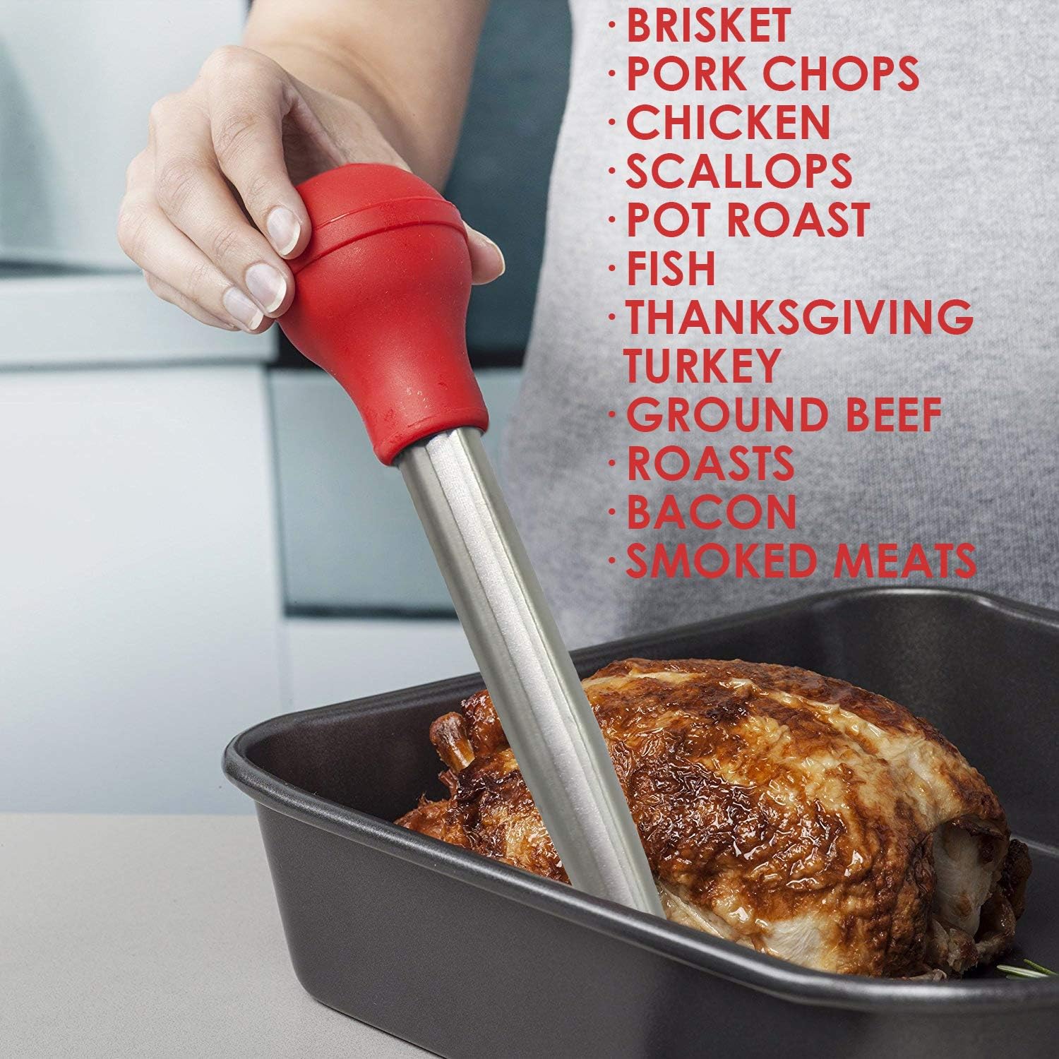 - GREAT DESIGN - Basting is the key to a roast turkey or chicken with moist, juicy meat and crisp skin, and our steel baster offers a traditional alternative to plastic versions. Made of heat-resistant stainless steel, it won't stain or retain grease and food odors, and it's easy to clean.