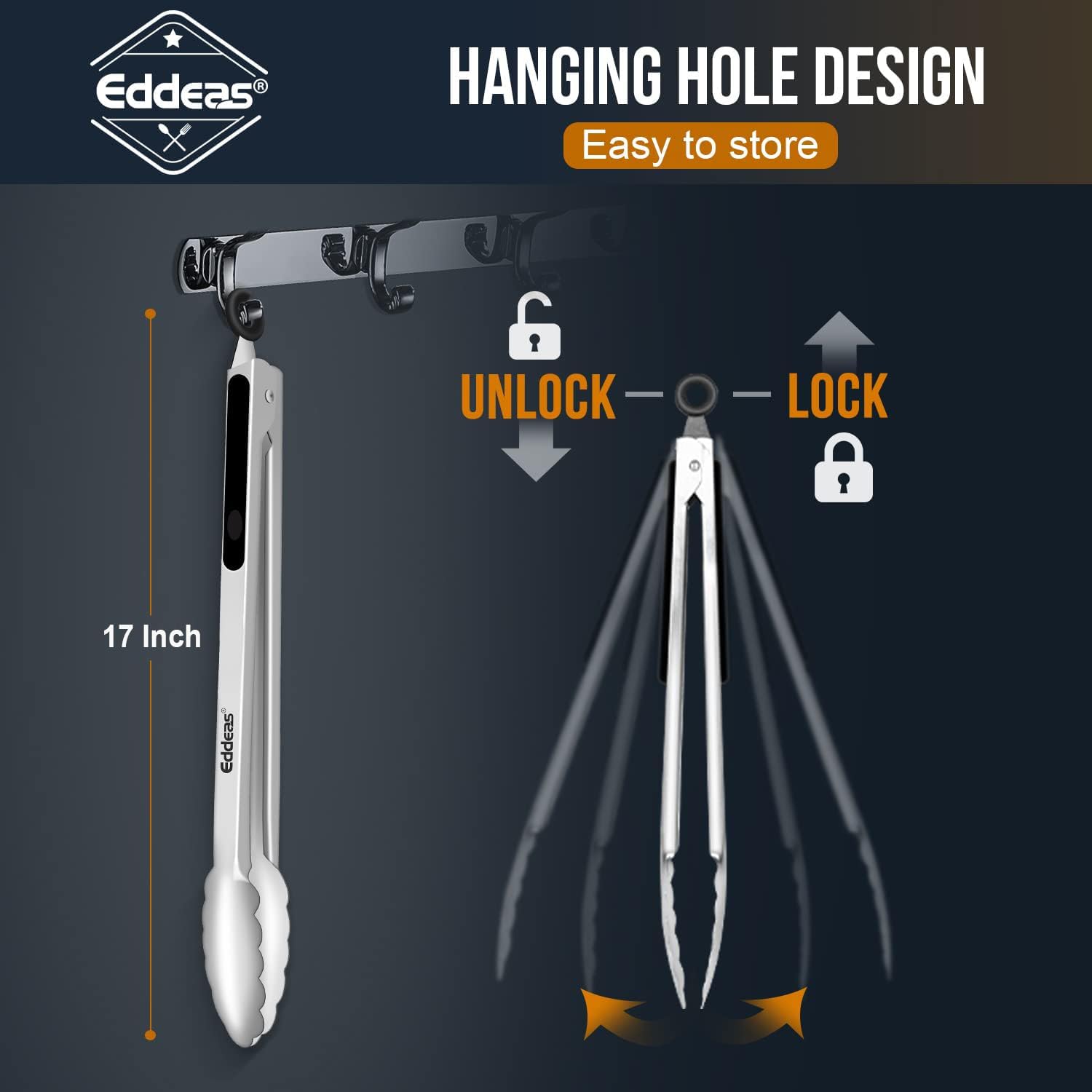 - MULTIPLE APPLICATION - Perfect for everyday or outdoor use, whether you use them as grill tongs, need reliable Heavy Duty Metal Locking Tongs to grab food from boiling water, or as a grill Turner, EDDEAS tongs will meet your needs for safety and stability.Size:17inch