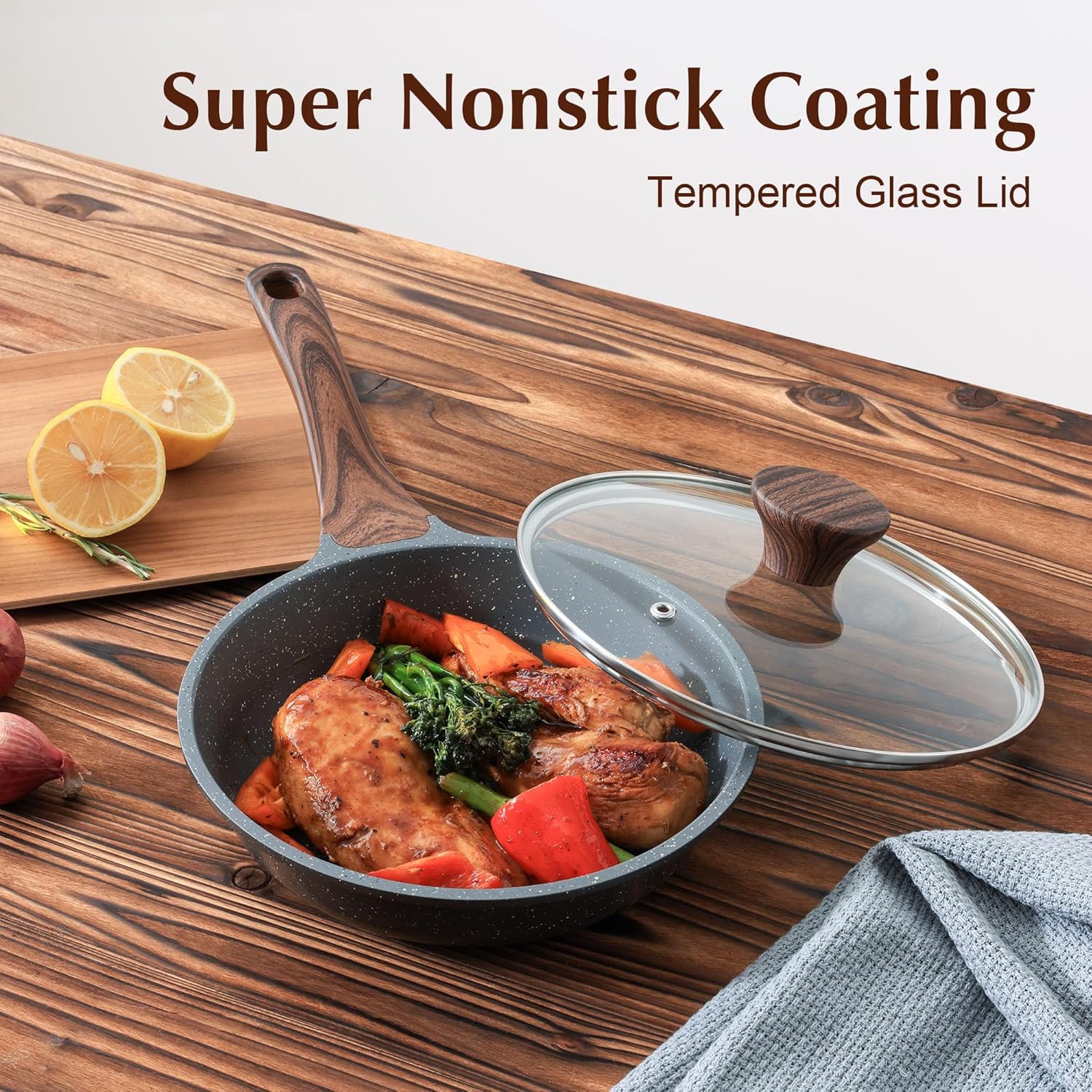 - Ergonomic Woodgrain Bakelite Handle - The handle of the 8inch nonstick cooking pan with lid features woodgrain design, it is comfortable to grip and stays cool while cooking. Oven safe up to 302Β°F.