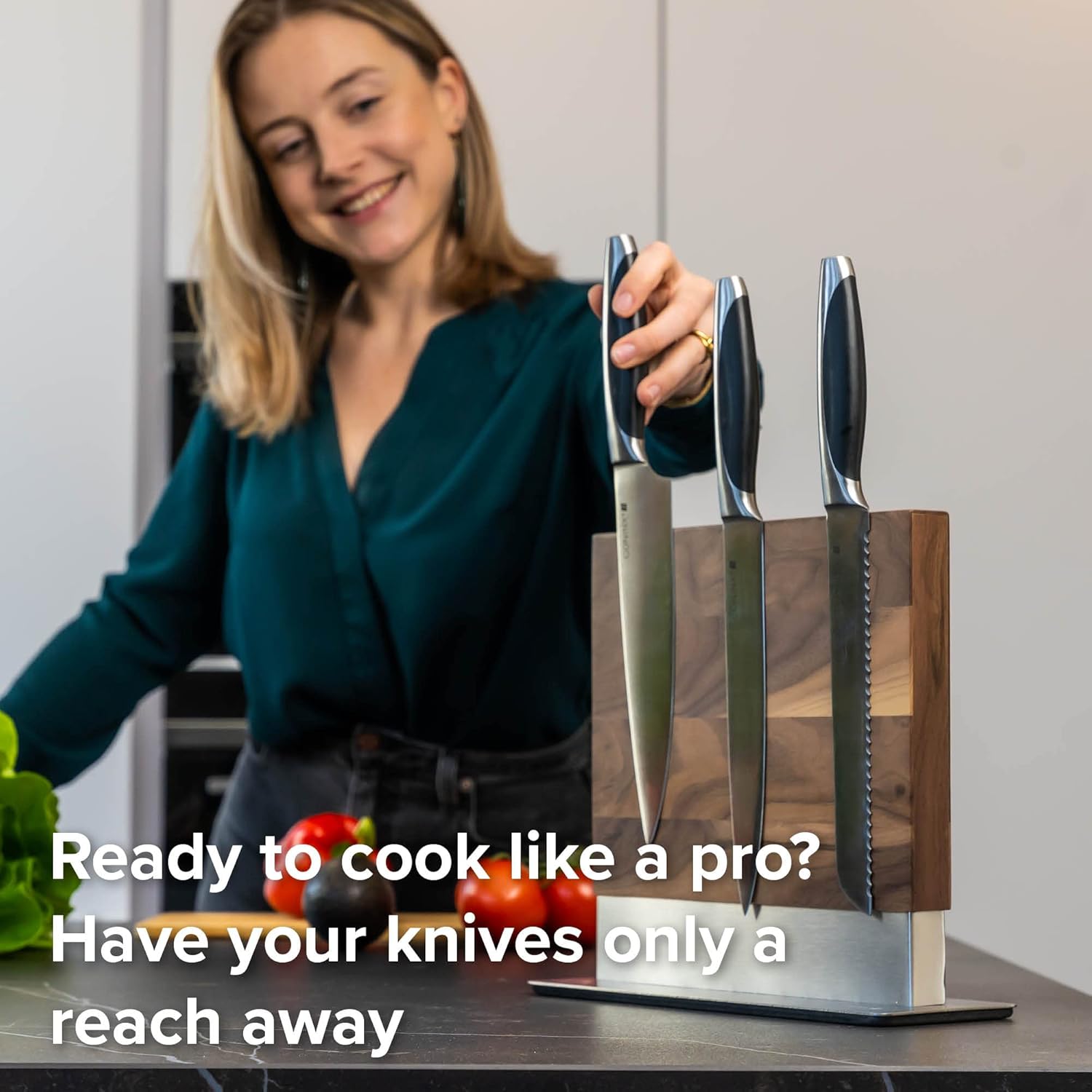 Coninx Magnetic Knife Holder with display stand, Double Sided Strong Magnetic Knife block for Kitchen counter top, Universal empty storage Organizer Block (Walnut Wood)