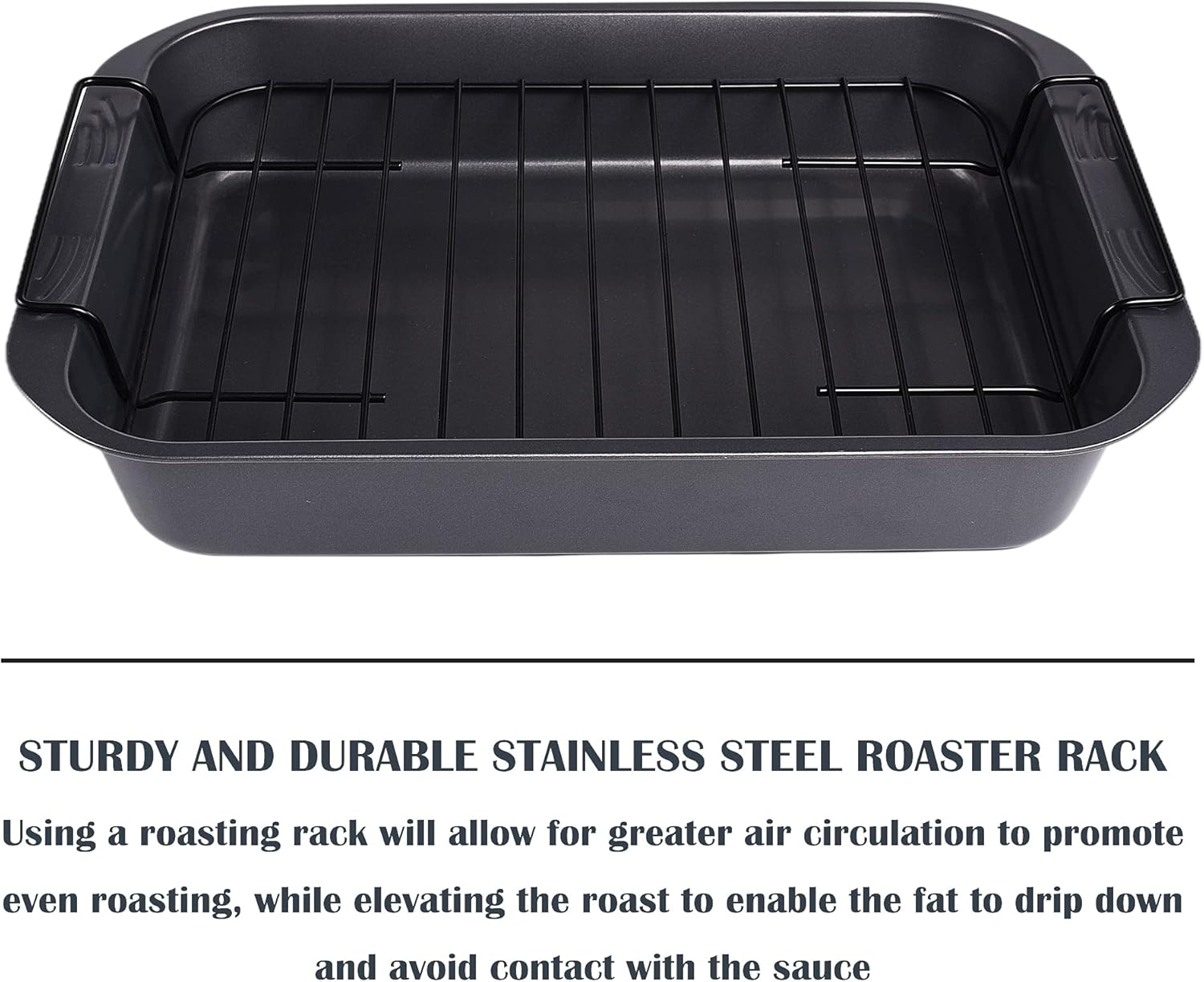 - SAFE AND DURABLE CONSTRUCTION: The roaster pan is made of heavy-gauge carbon steel, ideal for even and rapid heat absorption and distribution